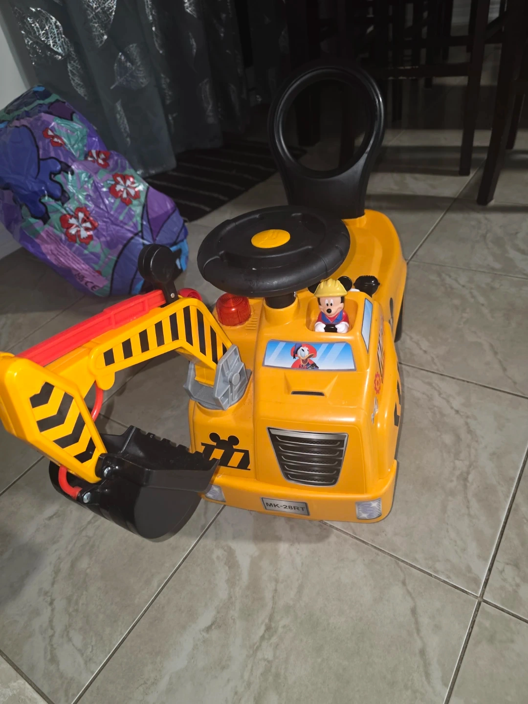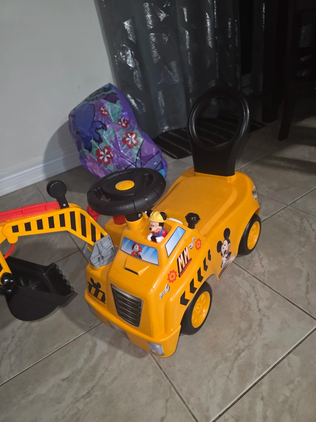 This is a fun yellow ride-on excavator toy for toddlers. It features a movable arm and bucket, steering wheel, and Mickey Mouse graphics. Made of durable plastic for playtime fun!