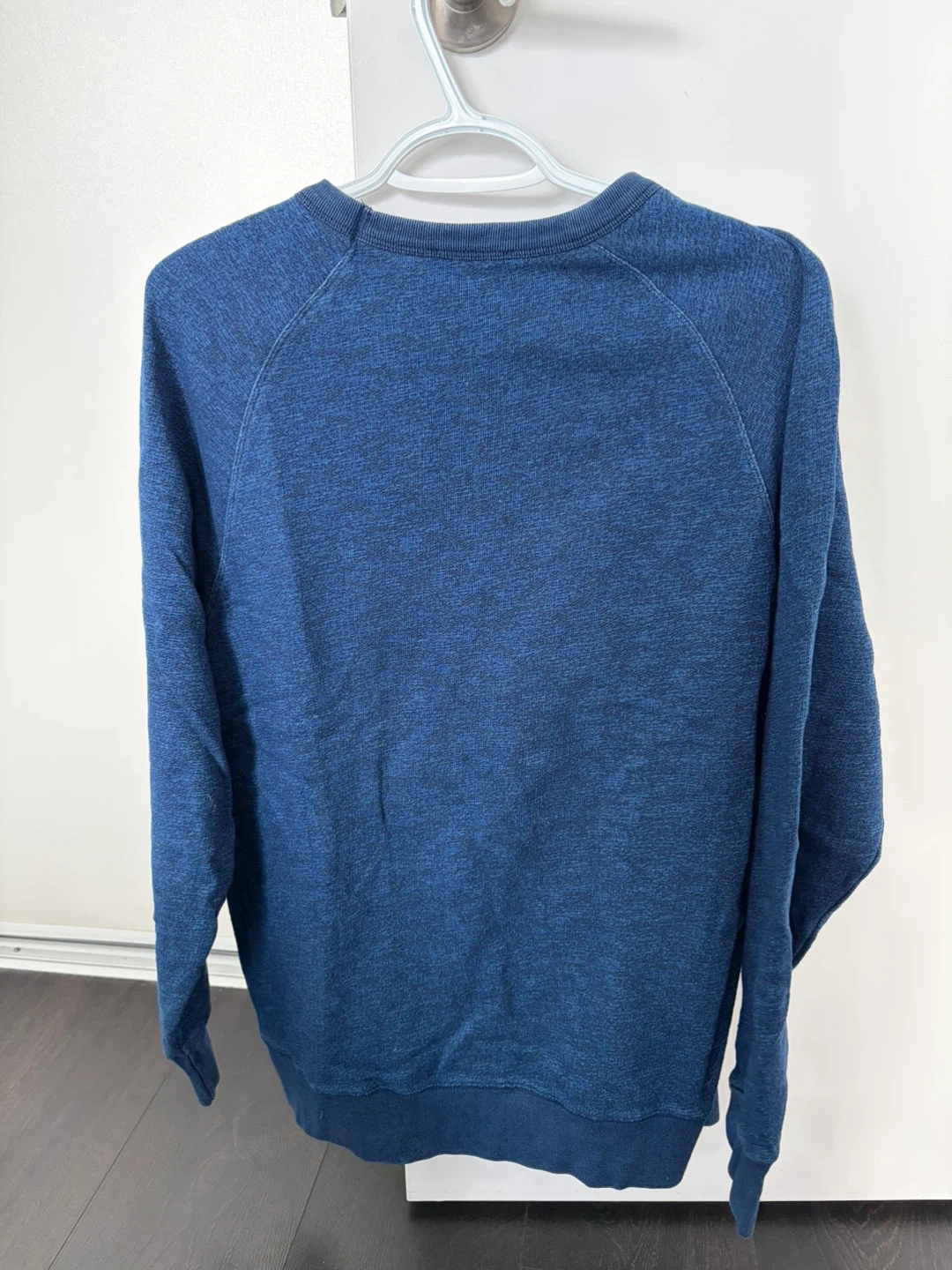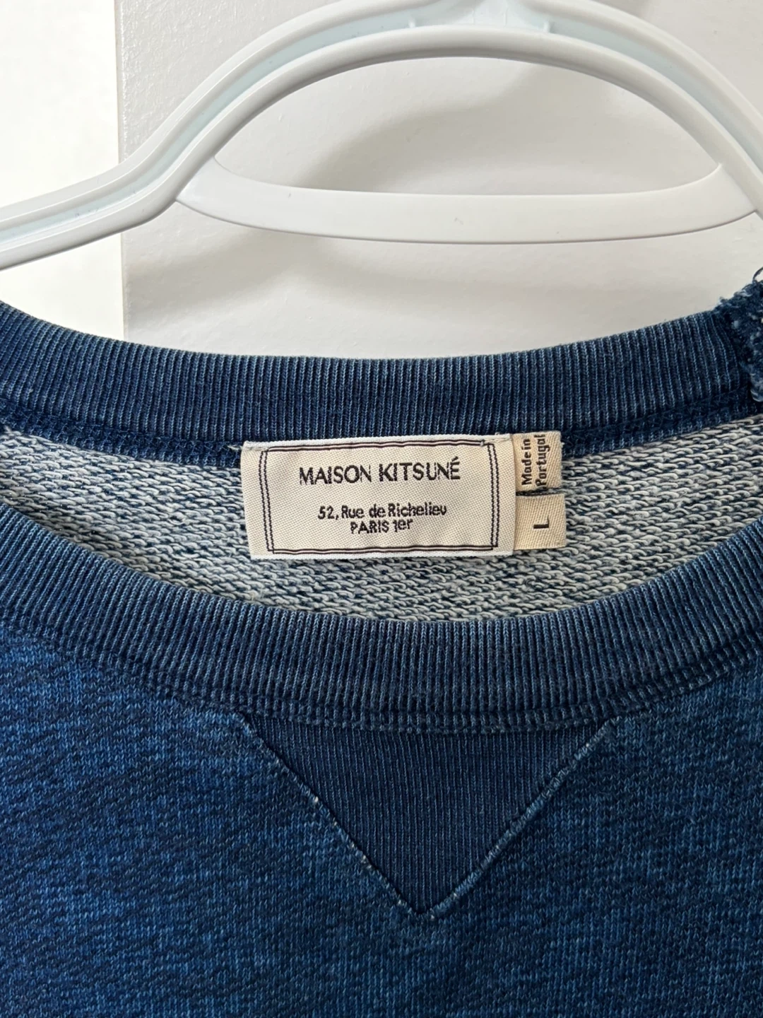 A classic Maison Kitsuné crewneck sweatshirt in a deep blue marled fabric. It features the iconic fox head logo graphic on the front. Size is large. Made in Portugal.