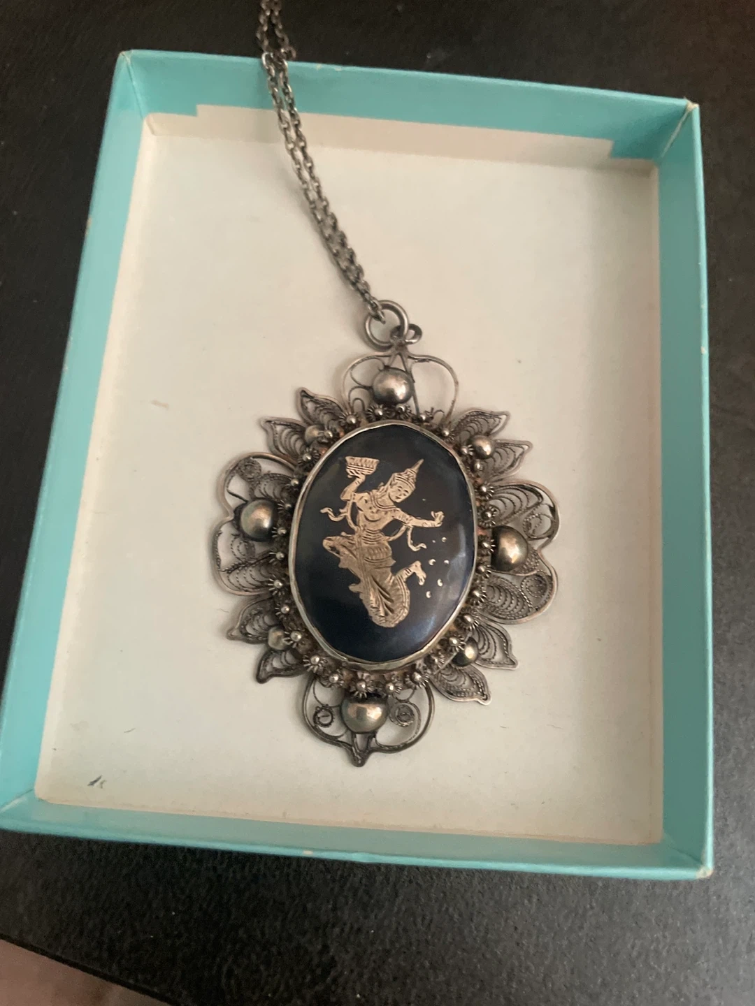 Selling a vintage silver filigree pendant necklace. It features a unique design with a dark oval center and intricate silver detailing. Comes in a box!