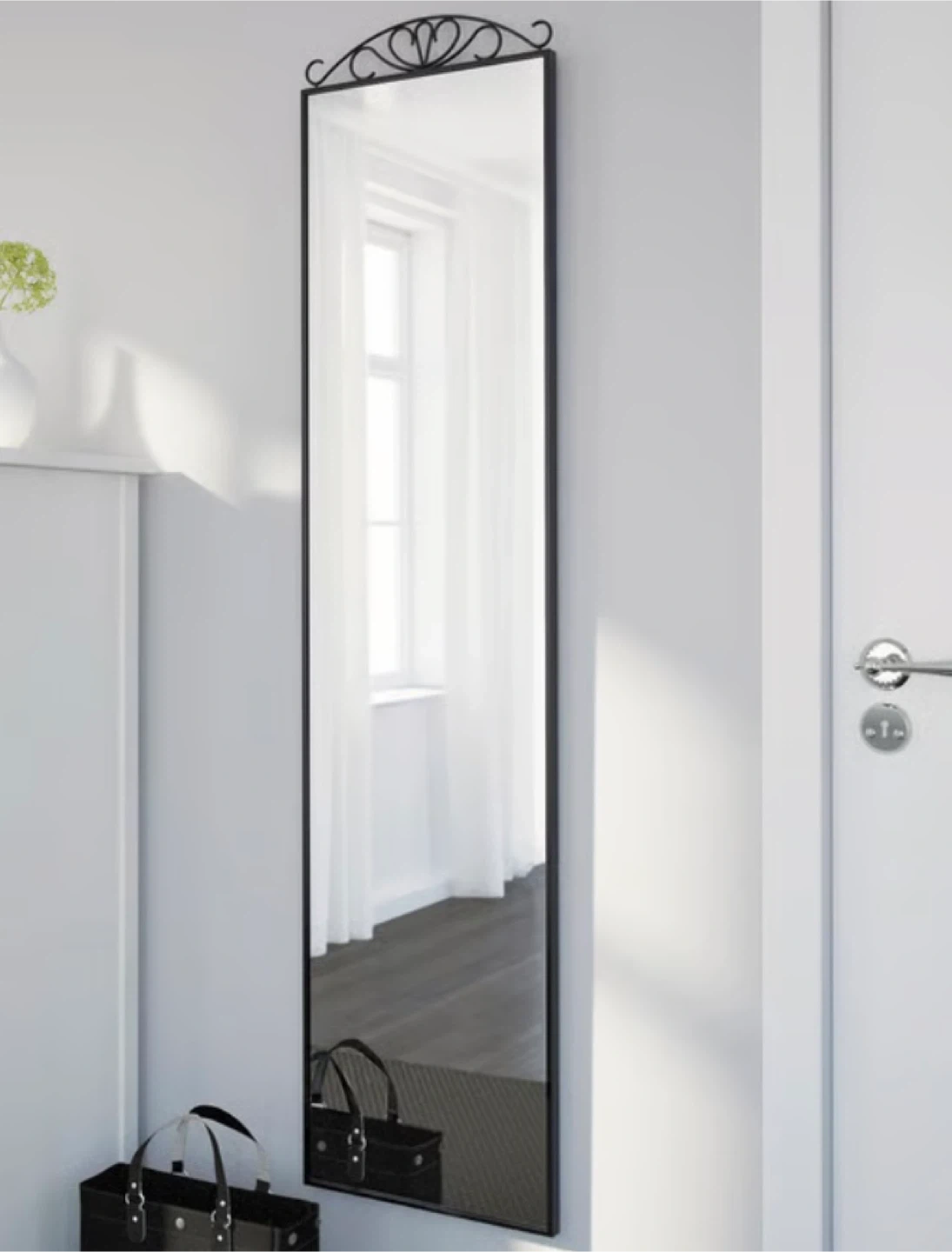 This tall standing mirror has a black metal frame with an ornate detail at the top. It's perfect for checking your outfit before heading out. The mirror is made of glass and metal.