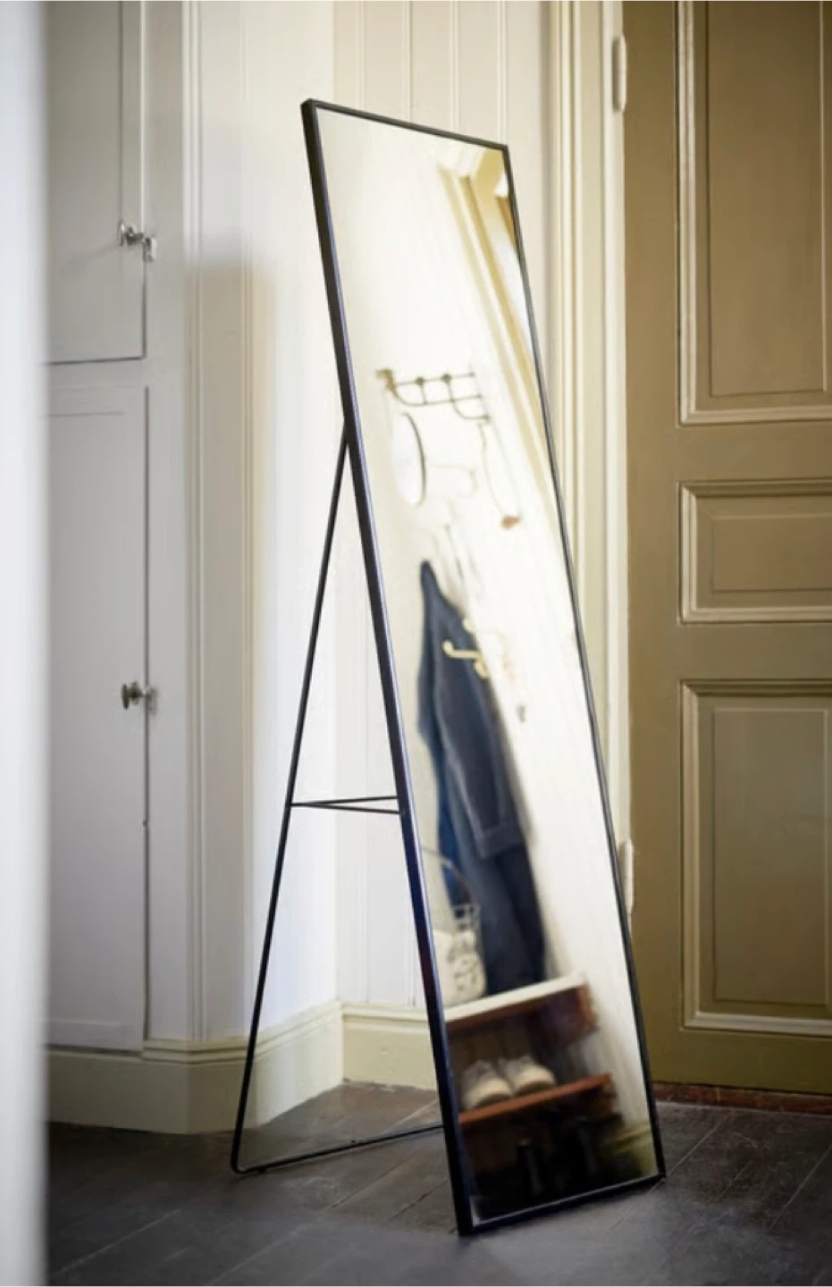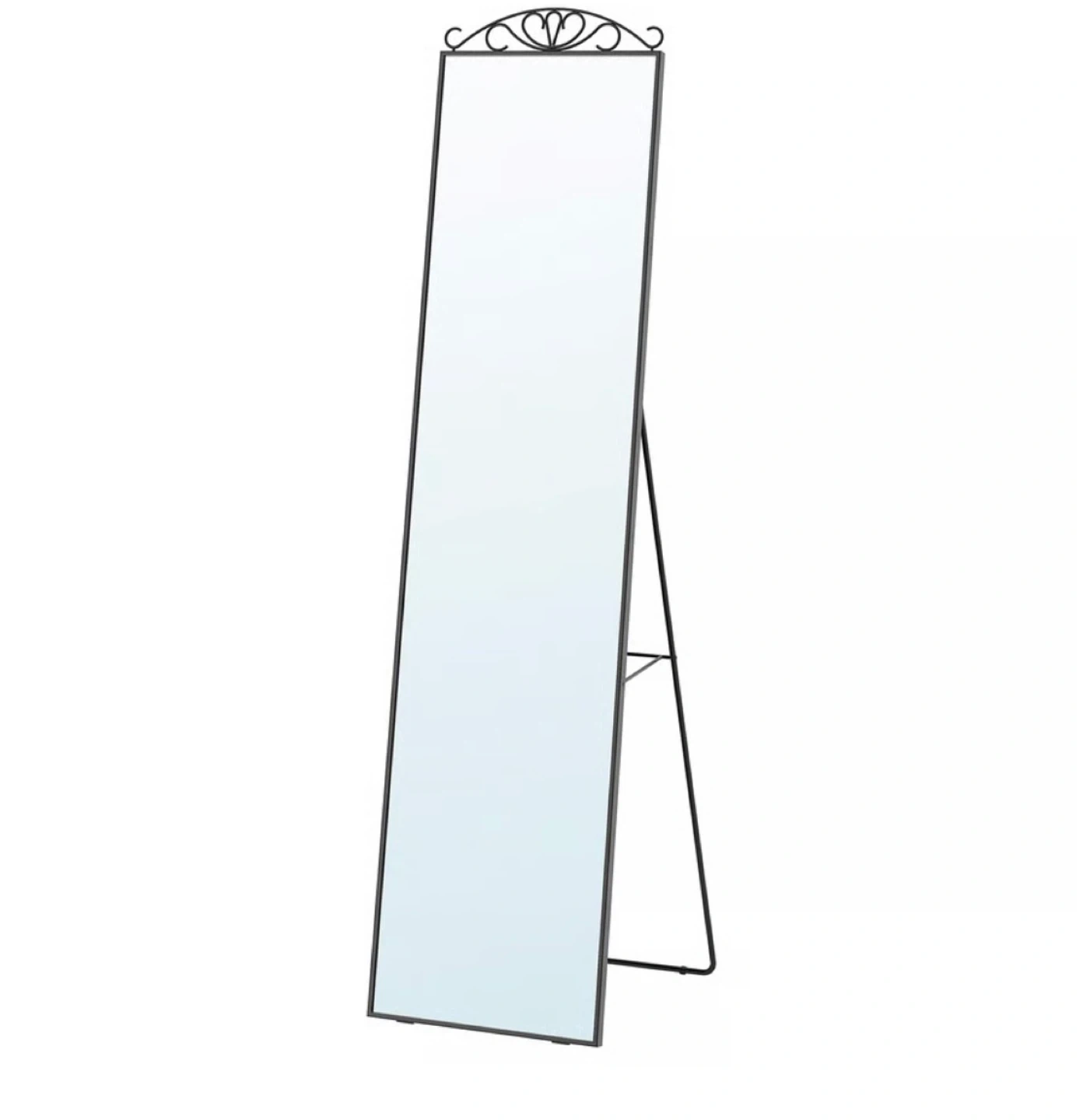 This tall standing mirror has a black metal frame with an ornate detail at the top. It's perfect for checking your outfit before heading out. The mirror is made of glass and metal.