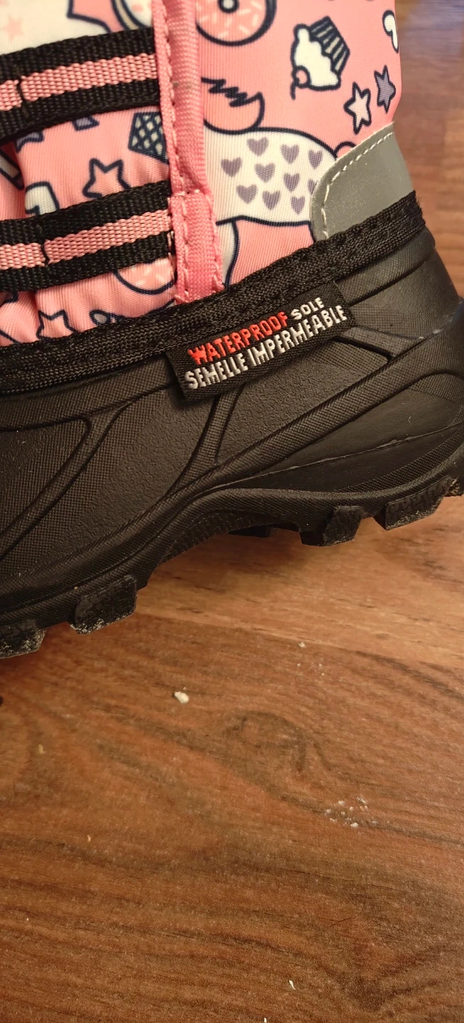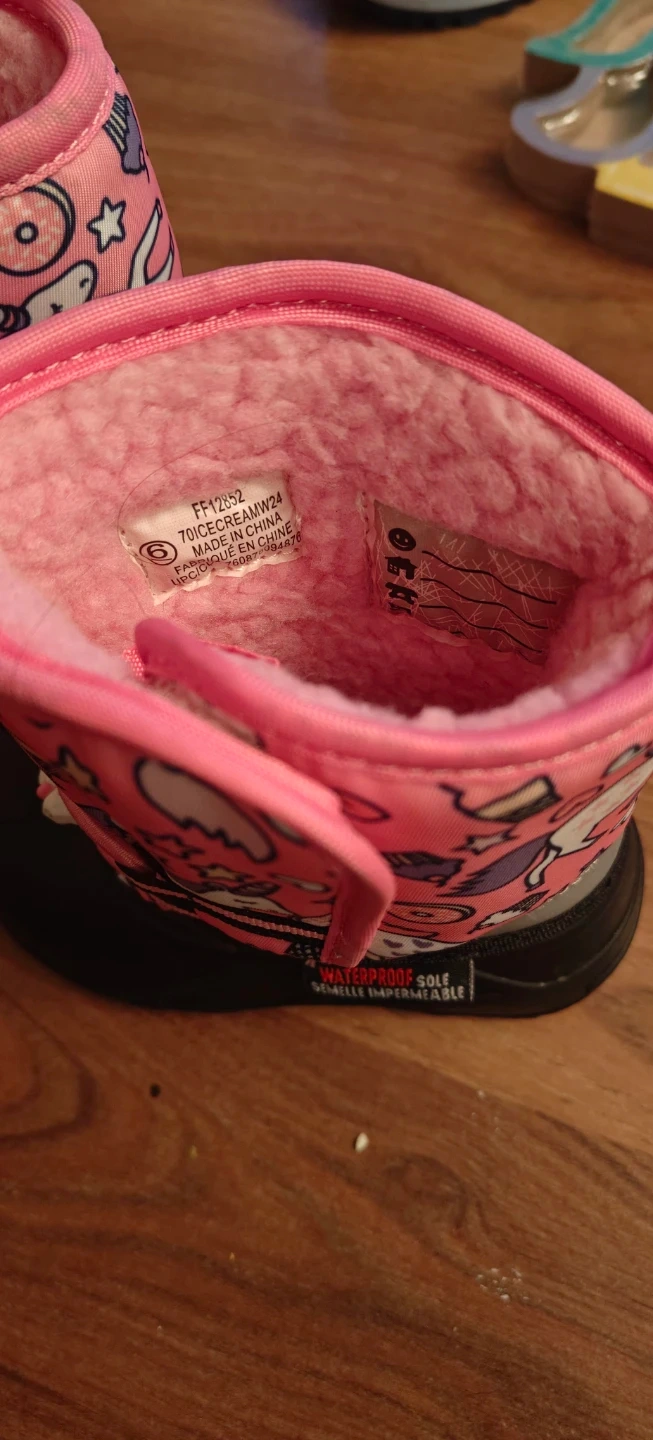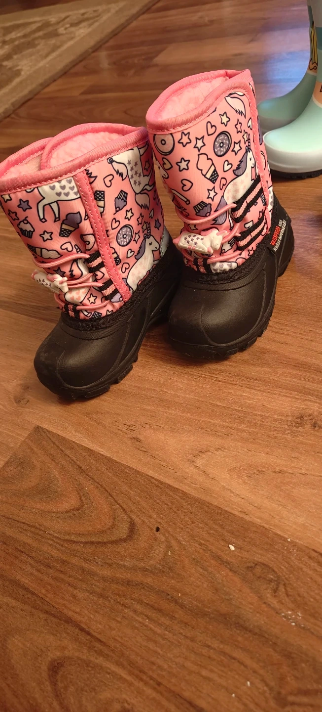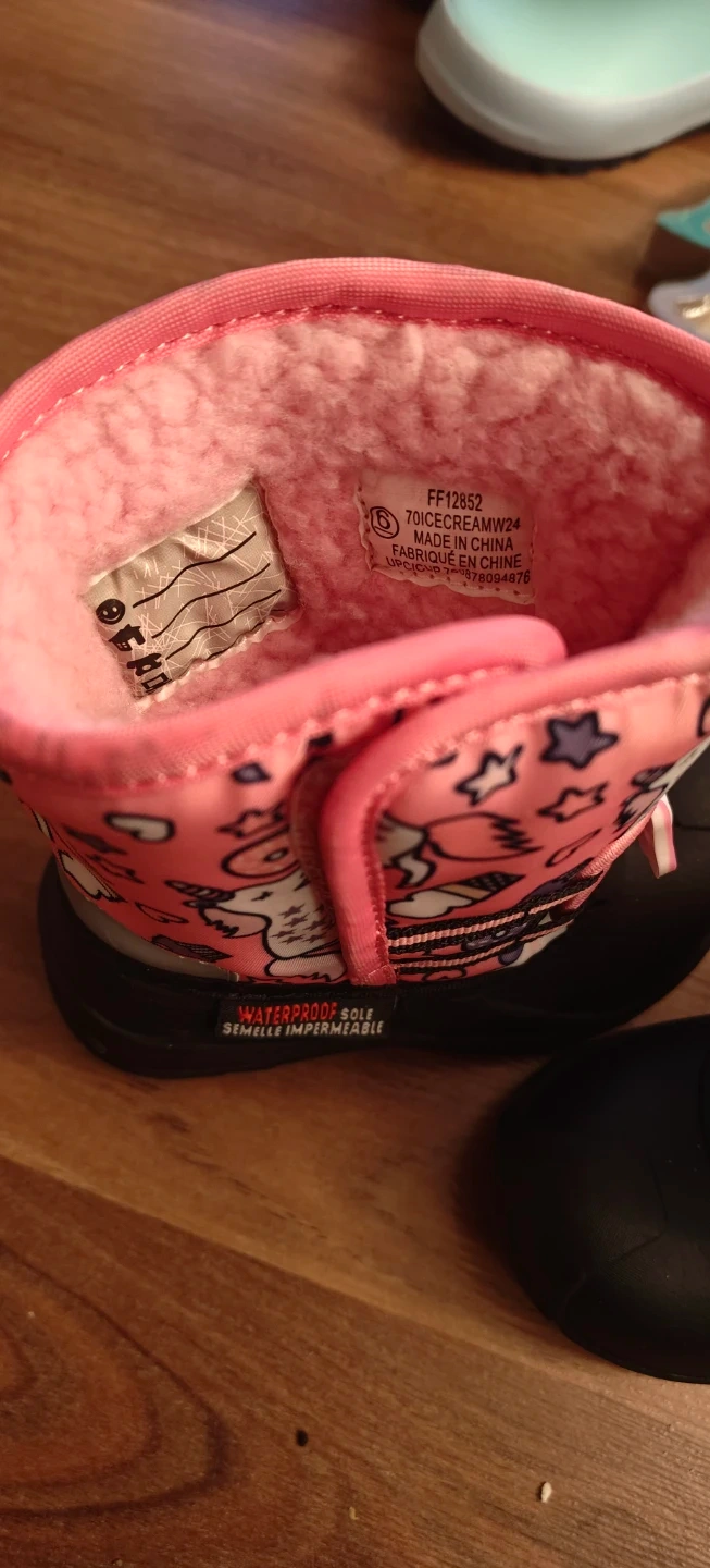 These adorable FF Ice Cream winter boots are perfect for keeping your little one's feet warm and dry! They're a size 8 and feature a waterproof sole. The cute pink design with unicorns, donuts, and cupcakes is sure to be a hit!