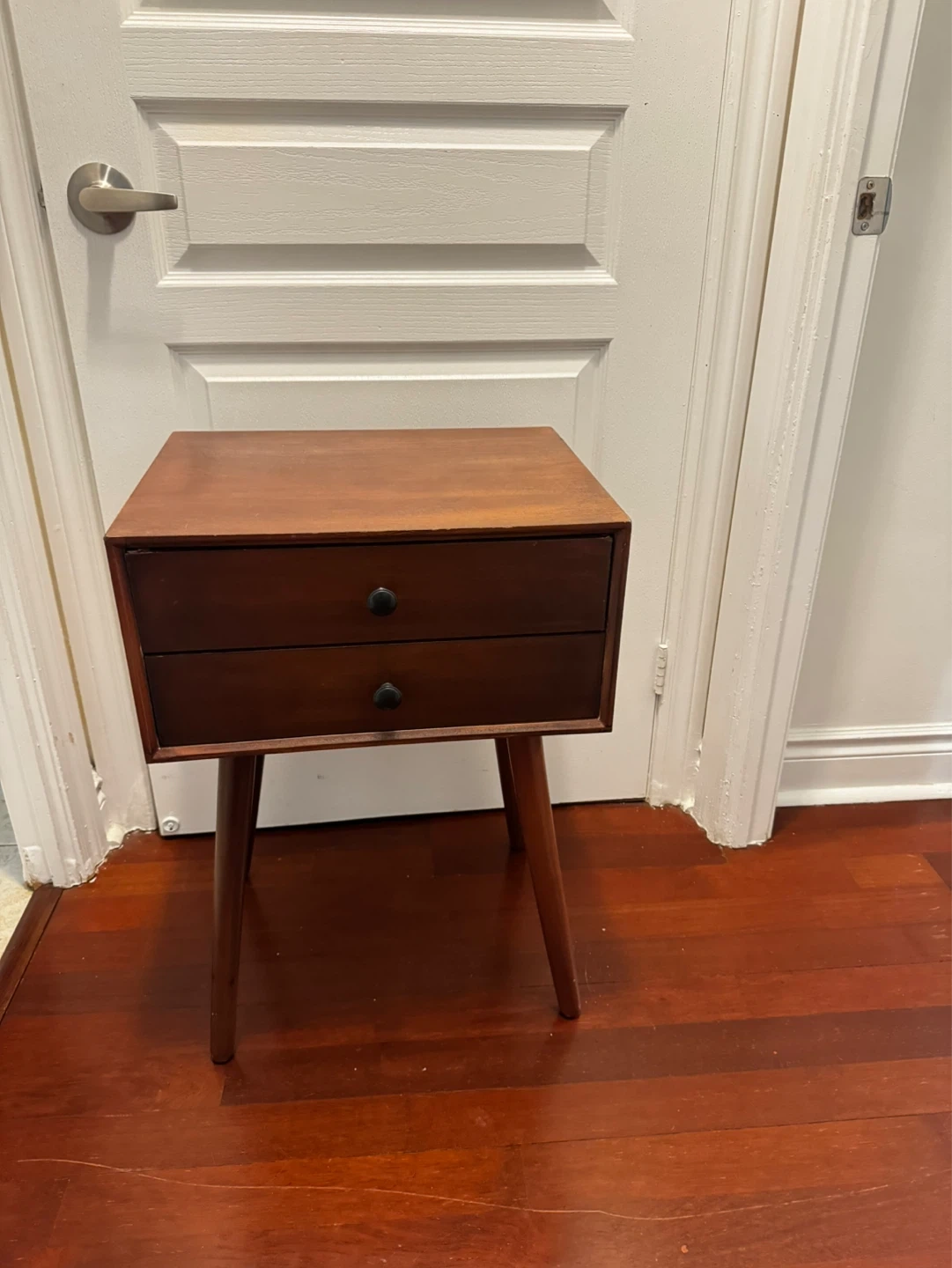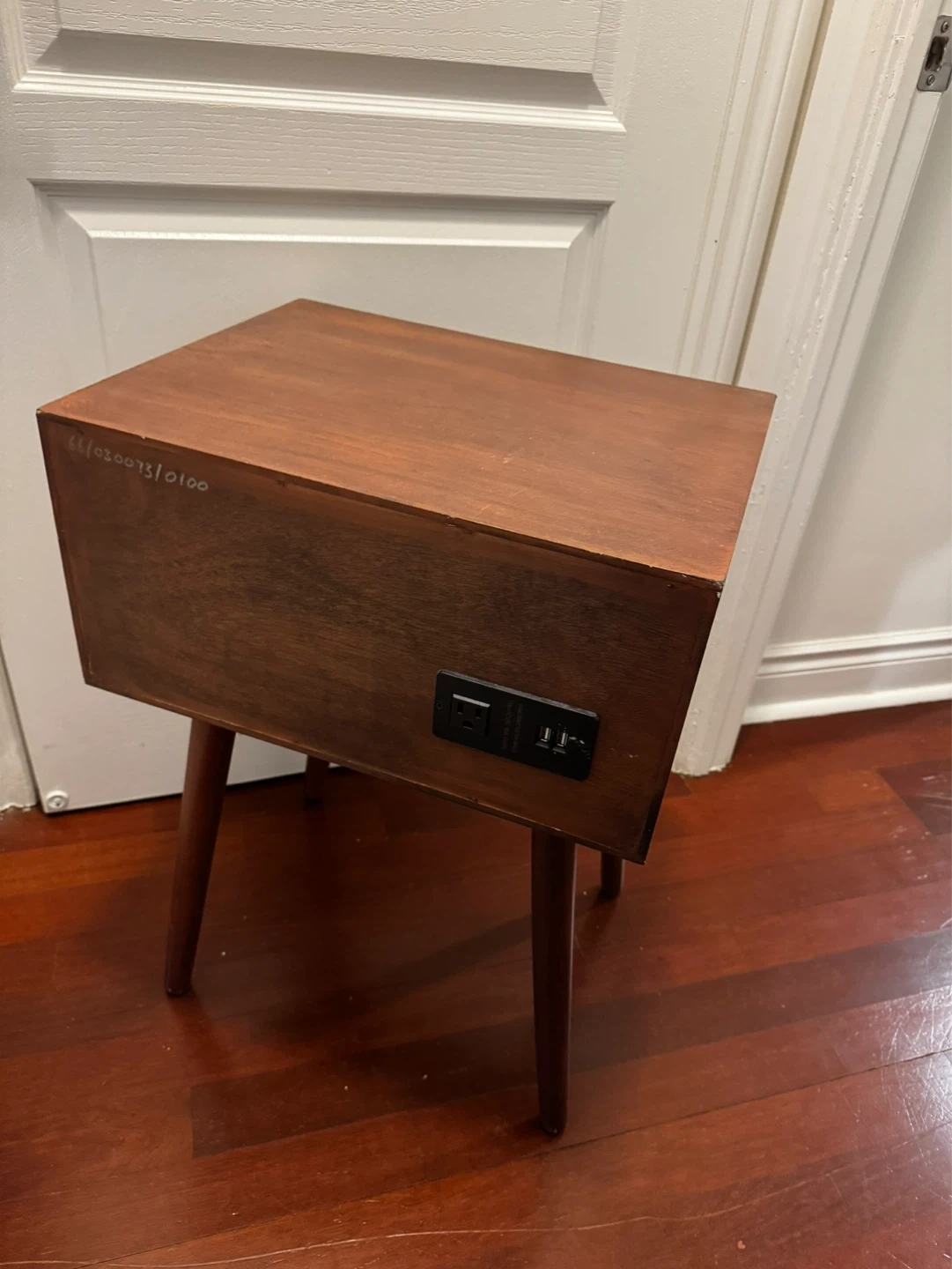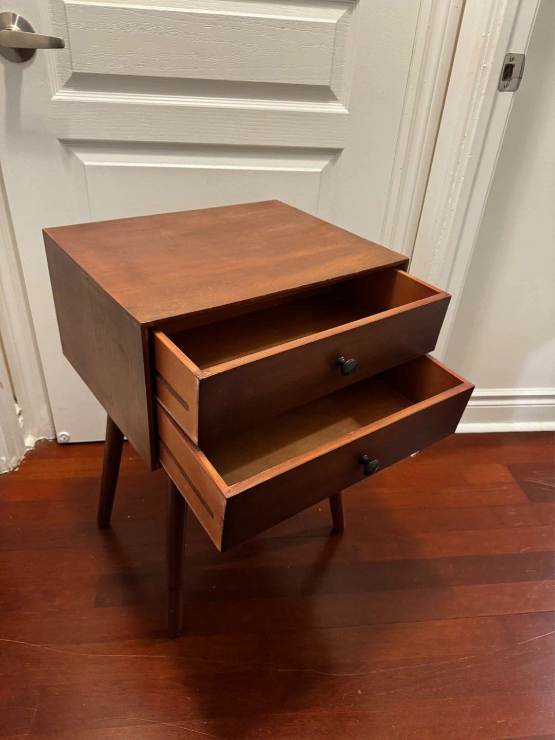 This mid-century modern side table features a warm wood finish and two spacious drawers with simple black knobs. It also includes built-in USB charging ports on the side, perfect for keeping devices powered up. It's a functional and stylish addition to any living room or bedroom!