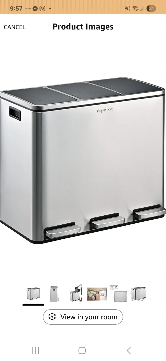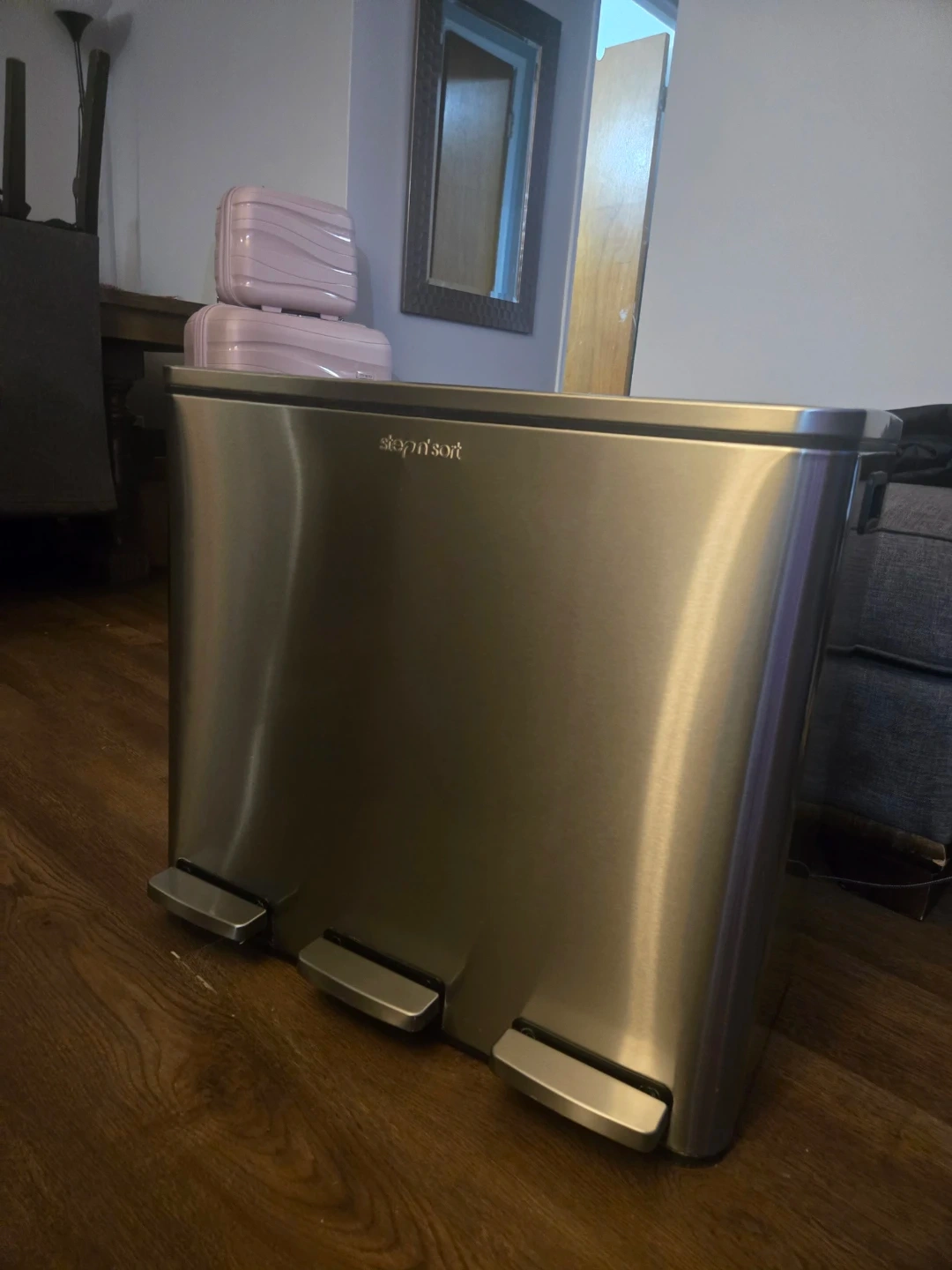 This Step N' Sort bin features three compartments, each holding 18L, for trash and recycling. It's made of stainless steel with slow-close lids and removable inner bins. The bin measures 60.96cm wide, 33.02cm deep, and 55.88cm tall.