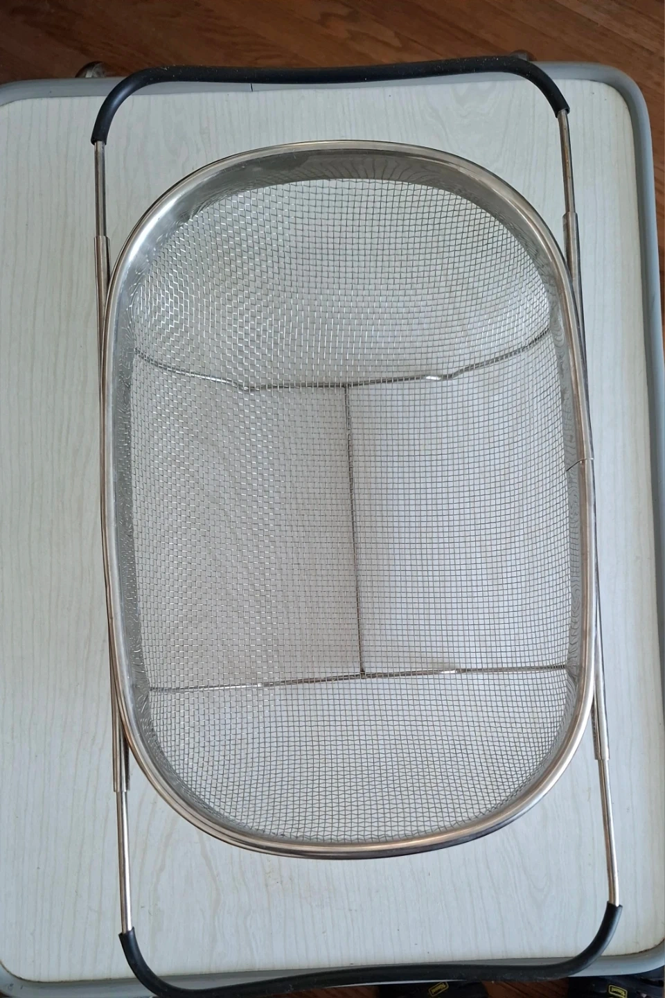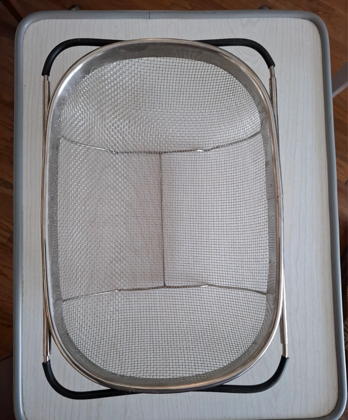 This stainless steel mesh strainer basket is perfect for washing produce or draining pasta. It features a durable metal construction with a fine mesh to catch small food particles. The foldable handles make it easy to store when not in use.