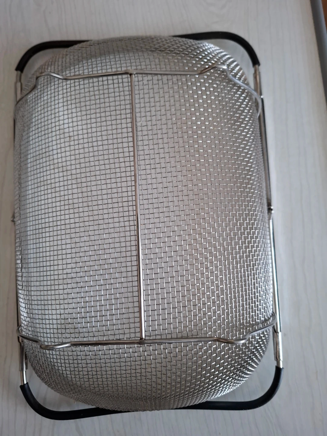 This stainless steel mesh strainer basket is perfect for washing produce or draining pasta. It features a durable metal construction with a fine mesh to catch small food particles. The foldable handles make it easy to store when not in use.