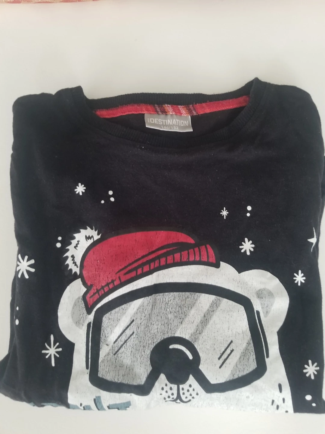 Black long-sleeved t-shirt from Destination. It features a graphic of a bear wearing a Santa hat and ski goggles, surrounded by snowflakes. Size is 146/152. Cotton material.
