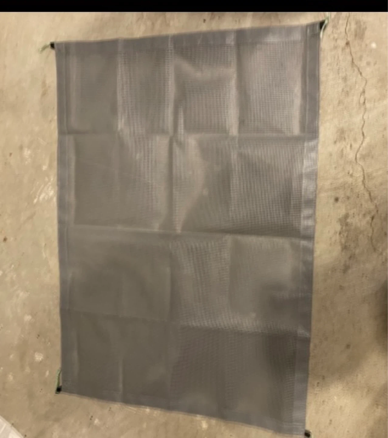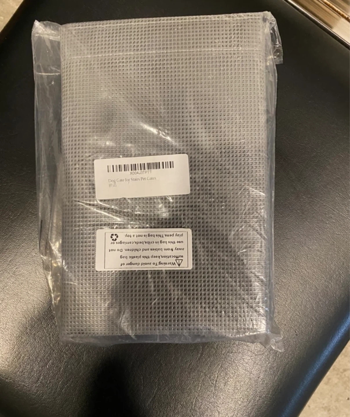 Mesh gate for pet containment. It's designed for stairs and pet areas. Made of durable mesh material. Comes with ties for secure installation.