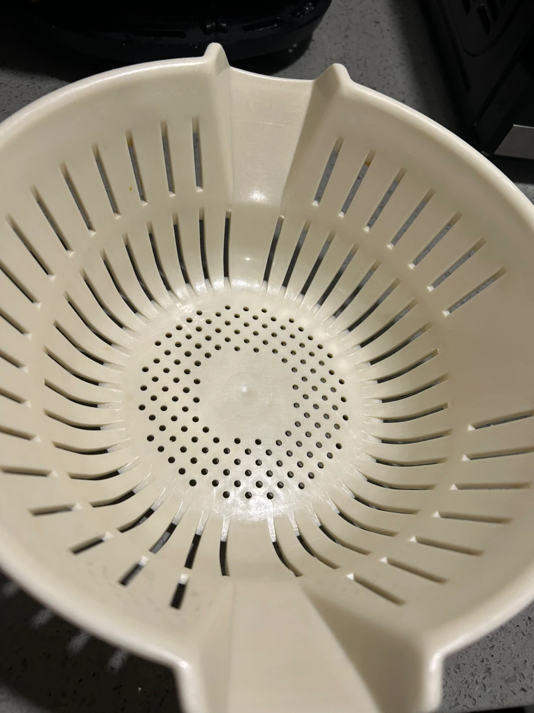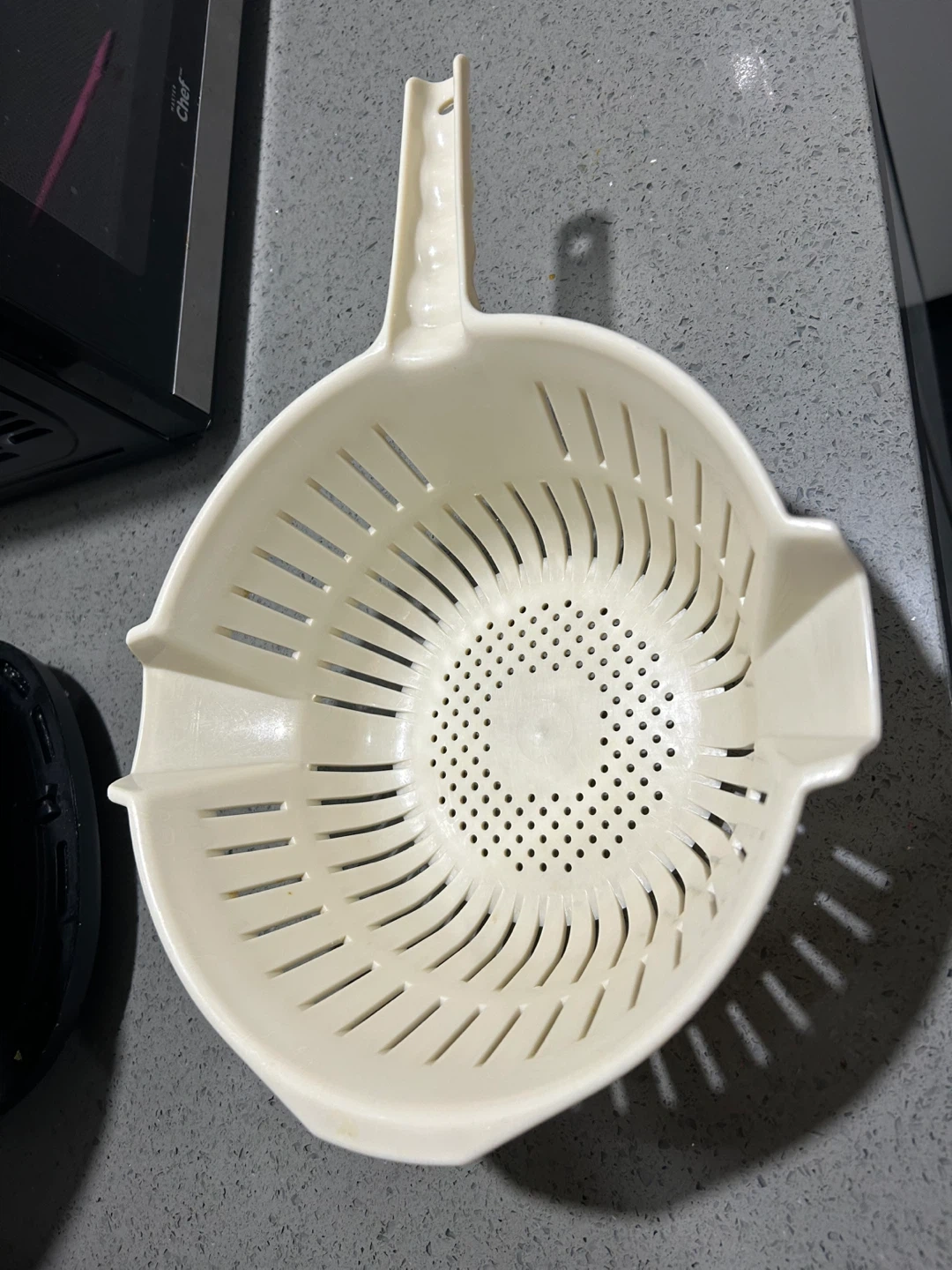 A cream-coloured plastic colander with a long handle and side handles. It's got a good amount of drainage holes! Perfect for straining pasta or washing veggies.