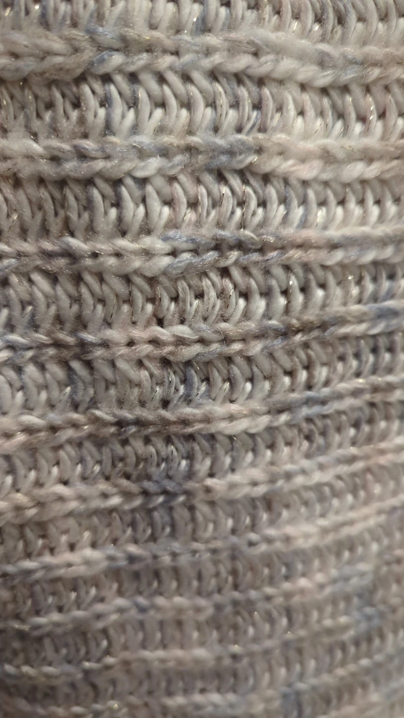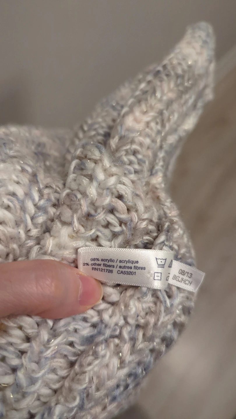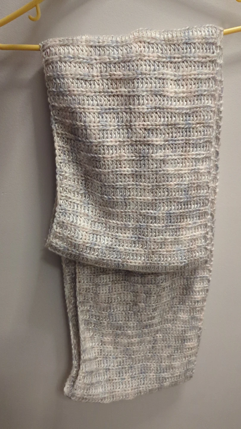 This white, blue-grey infinity scarf is made of 98% acrylic and 2% other fibers. It's a cozy and stylish accessory for cooler weather.