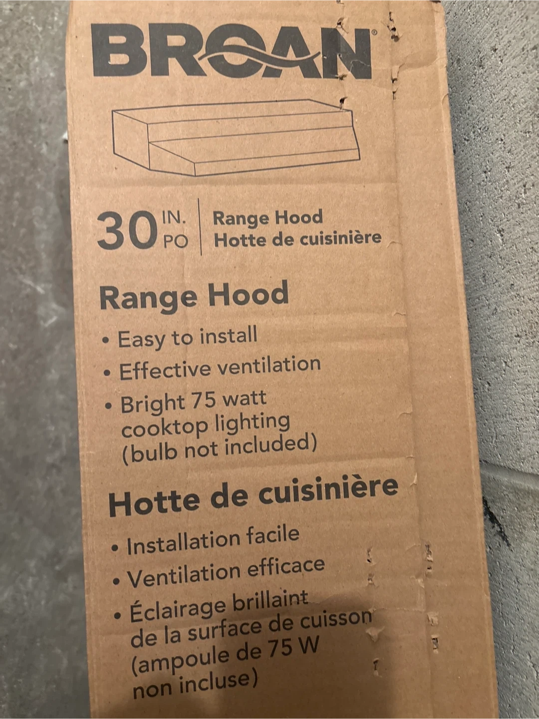 This is a 30-inch Broan range hood. It's designed for ducted or non-ducted installation and is easy to install. Features bright 75-watt cooktop lighting, but the bulb is not included.