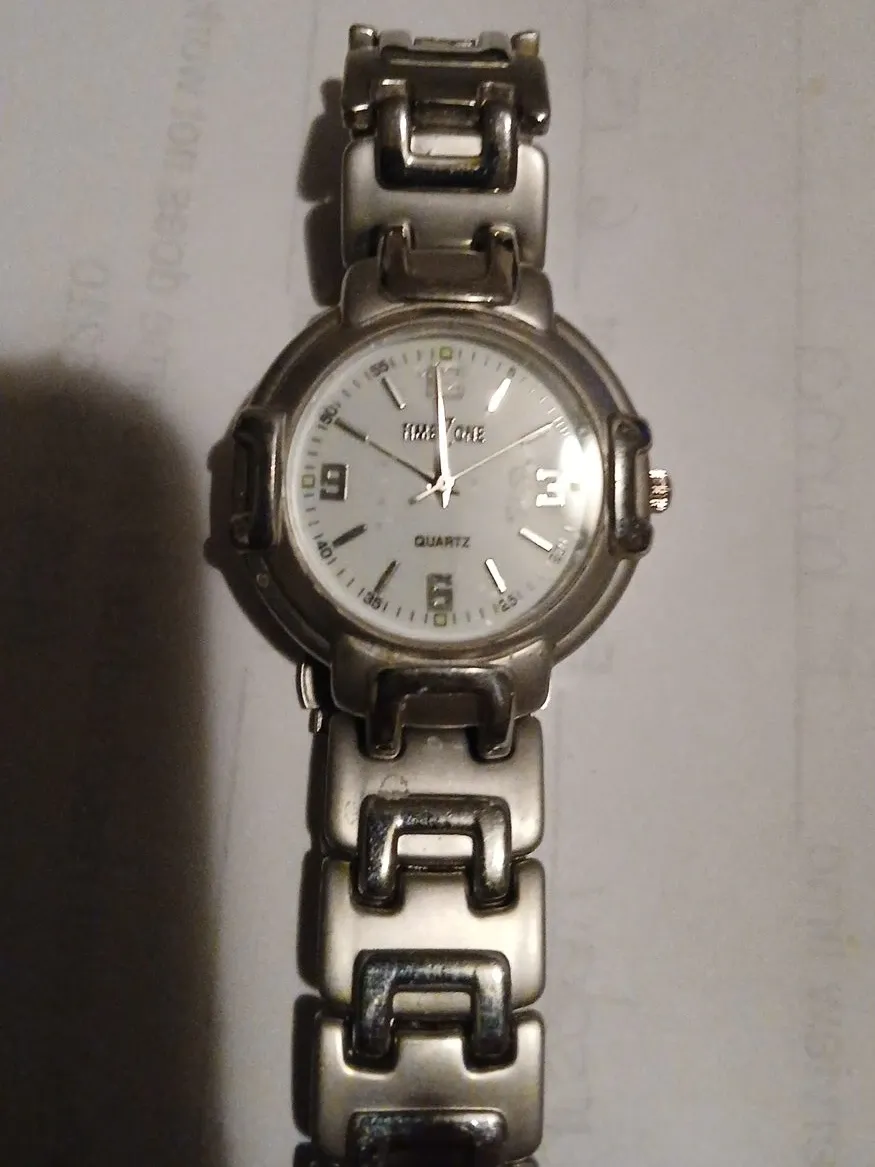 This is a Time Zone quartz watch with a silver-tone metal band. It has a white face with silver hour markers and a date window at the 3 o'clock position. The watch is made of metal. It's a reliable timepiece for everyday wear.
