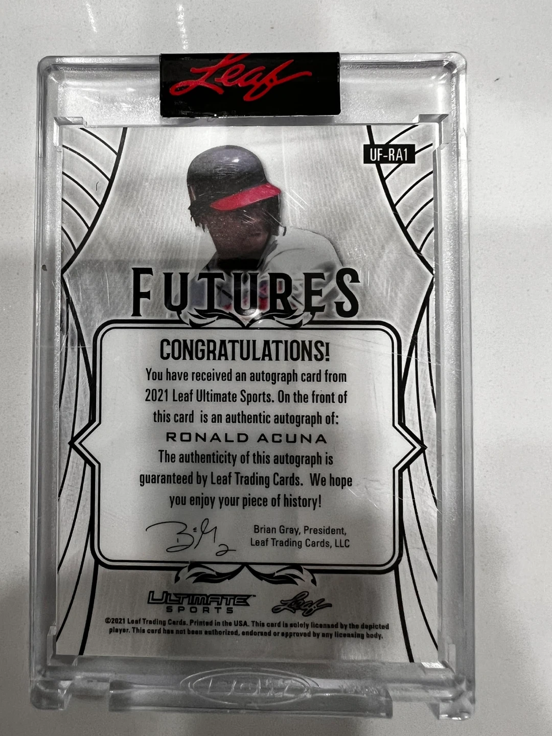 Selling a Ronald Acuna autographed trading card from 2021 Leaf Ultimate Sports Futures series. This card is authenticated by Leaf Trading Cards. It's numbered 22/25.