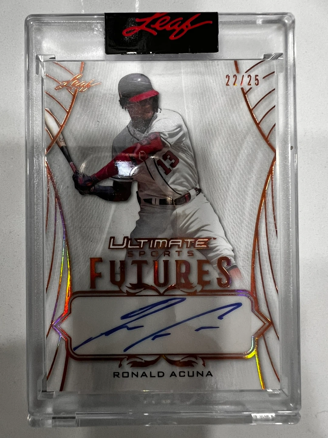 Selling a Ronald Acuna autographed trading card from 2021 Leaf Ultimate Sports Futures series. This card is authenticated by Leaf Trading Cards. It's numbered 22/25.