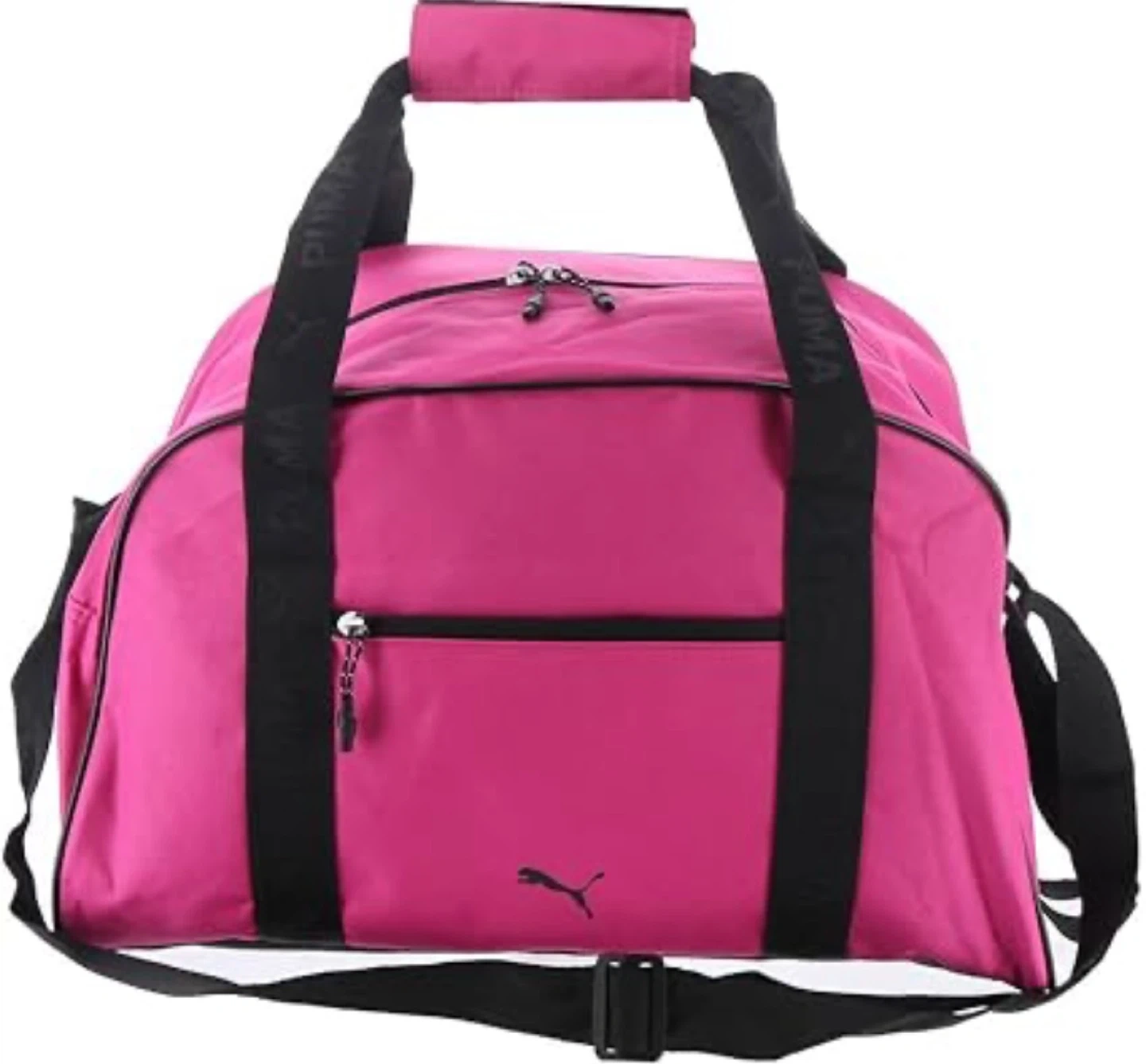 This is a bright pink duffel bag from Puma. It features dual top handles and a detachable shoulder strap for versatile carrying options. The bag has a zippered main compartment and an exterior zippered pocket for quick access to essentials. $20