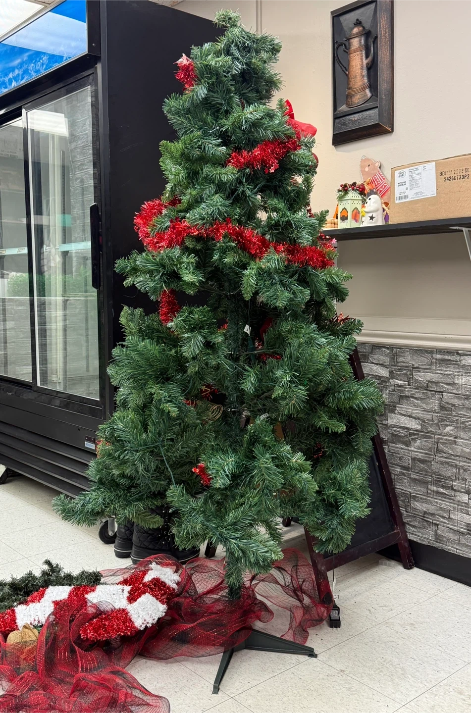 This is a pre-lit artificial Christmas tree. It's decorated with a festive red tinsel garland and a red bow on top. It has a sturdy stand and is ready for your favourite ornaments. Perfect for bringing holiday cheer to your home!