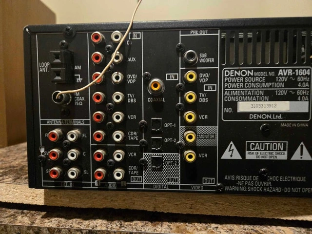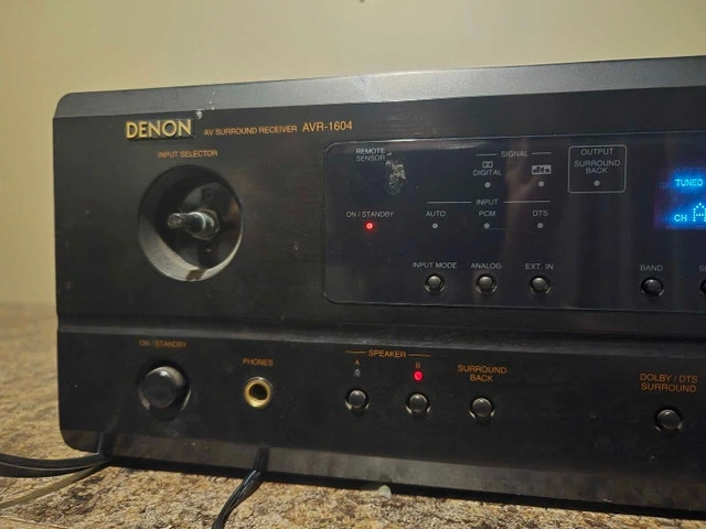 Selling a used Denon AVR-1604 AV surround receiver, perfect for your home theatre setup. Tested outputs front A/B, tuner, and the remote work awesome. This receiver delivers great sound quality and supports multiple audio formats. This unit is in good working order and provides reliable performance. Features include Dolby Digital and DTS decoding, multiple audio inputs and outputs, AM/FM tuner, and remote control included. If the ad is up, it's available!