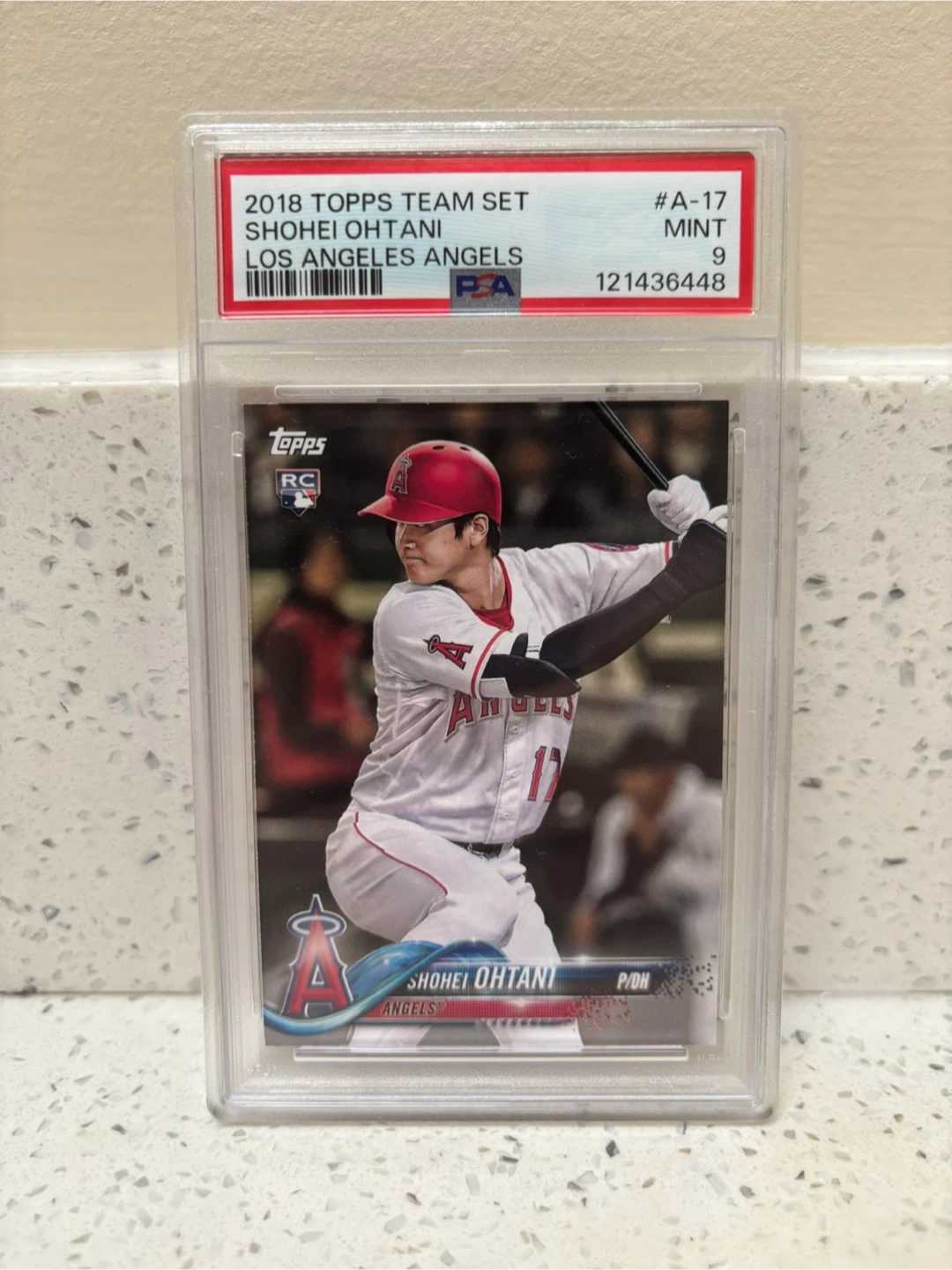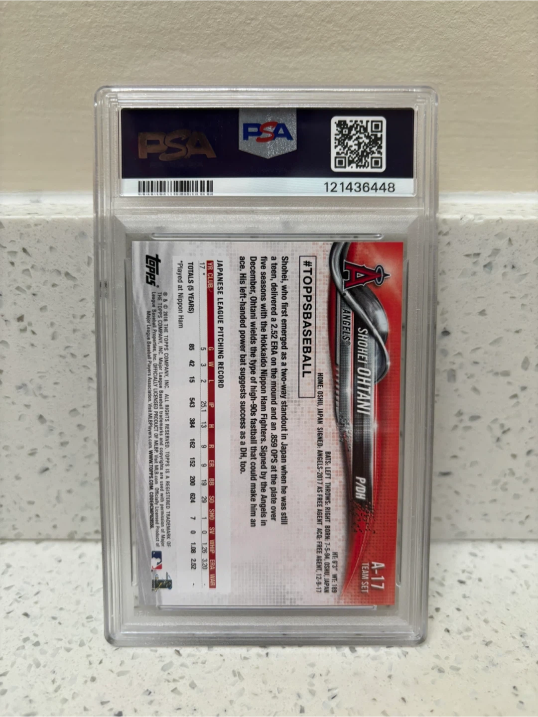 This is a 2018 Topps Team Set card featuring Shohei Ohtani of the Los Angeles Angels. It's a rookie card graded PSA 9 Mint. Card number A-17.