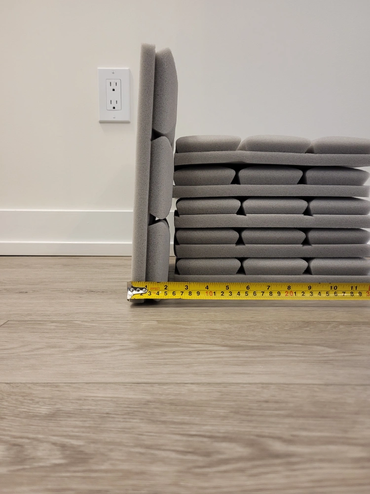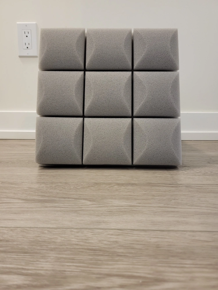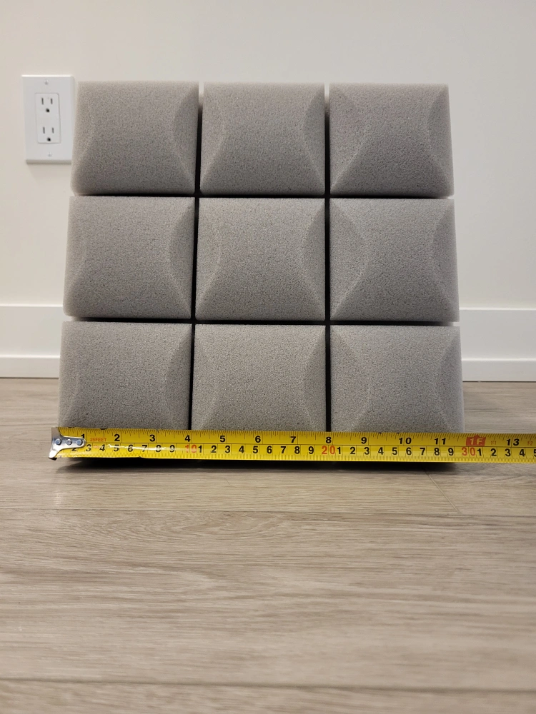 Twelve grey acoustic foam tiles. Great for sound dampening. Approximately 12" x 12" each. New, in plastic packaging. Comes with adhesives to stick to wall etc.
