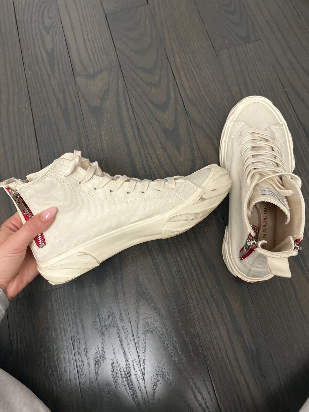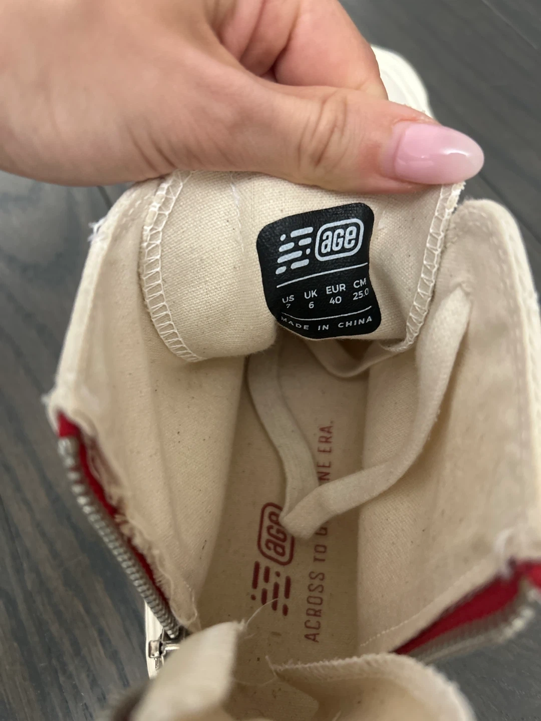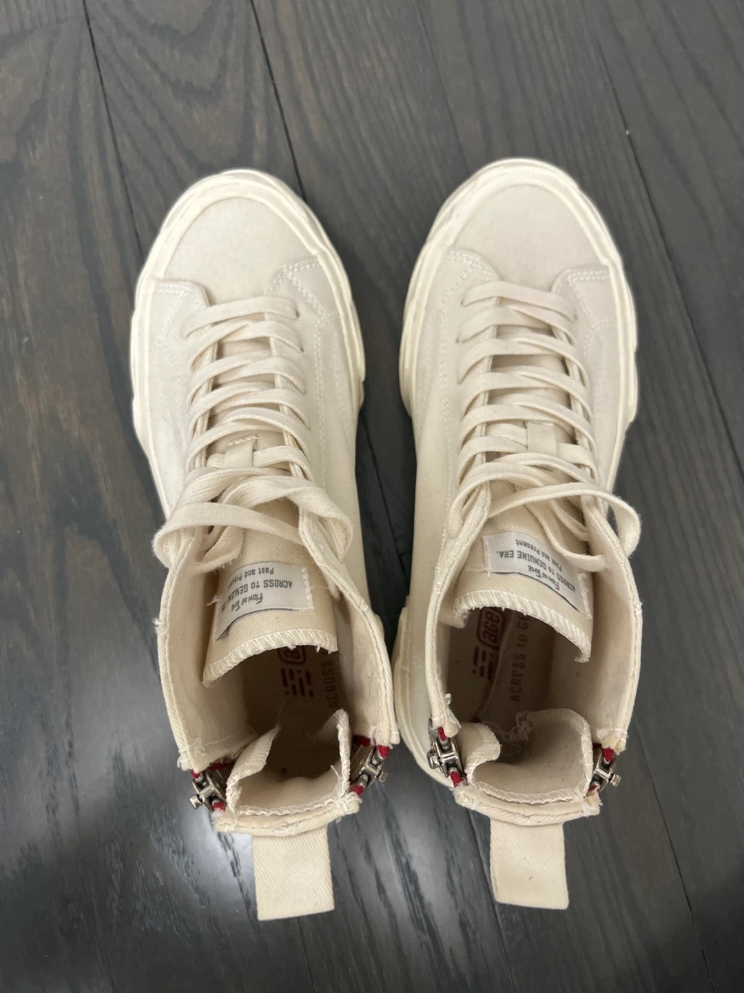Cream canvas high-top sneakers with a side zipper and lace-up front. Size 6 UK / 40 EUR / US 7. 25.0 CM. Made in China.