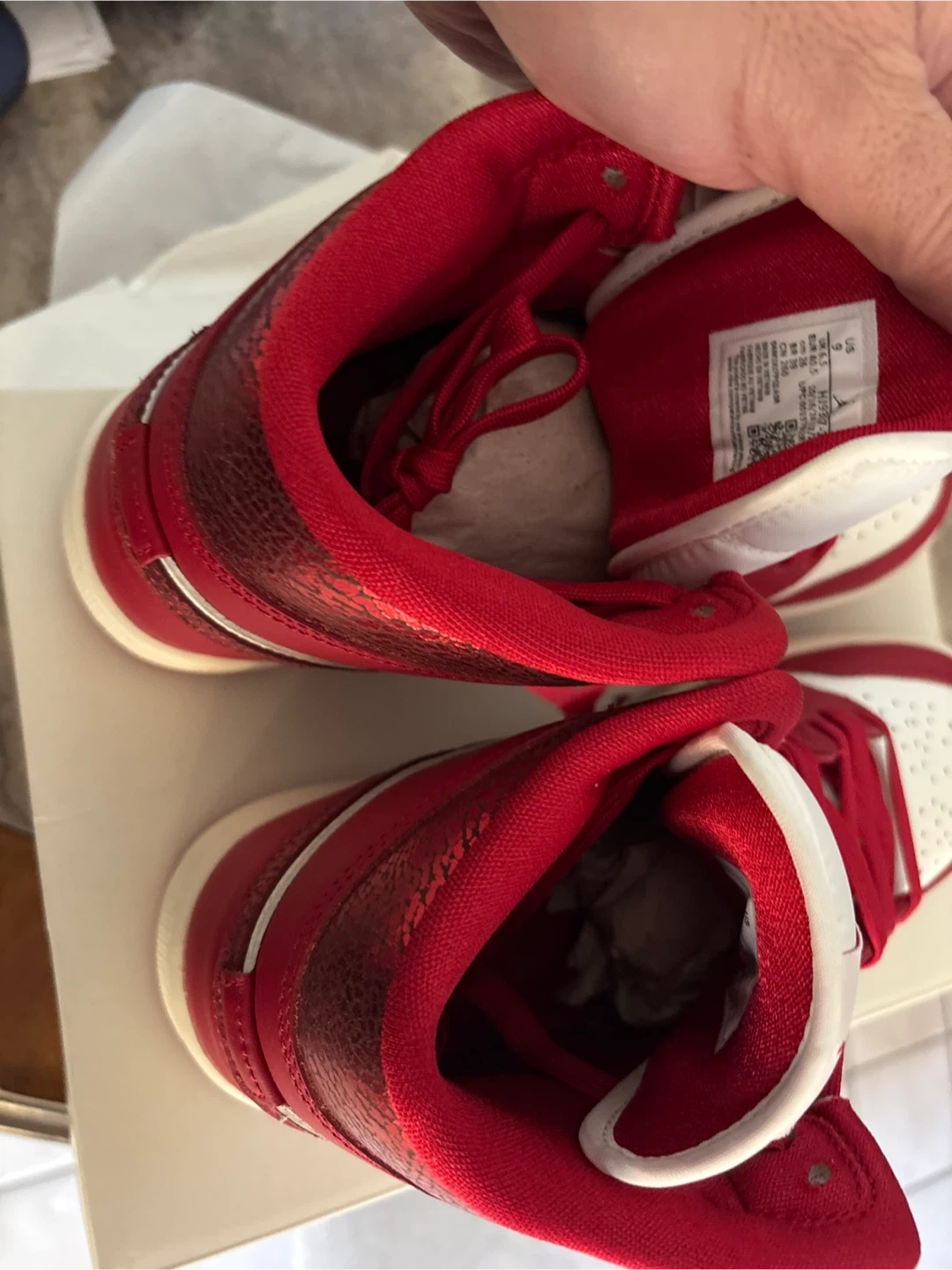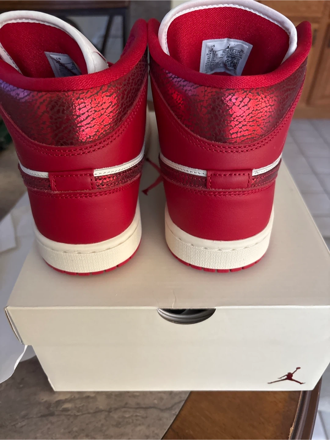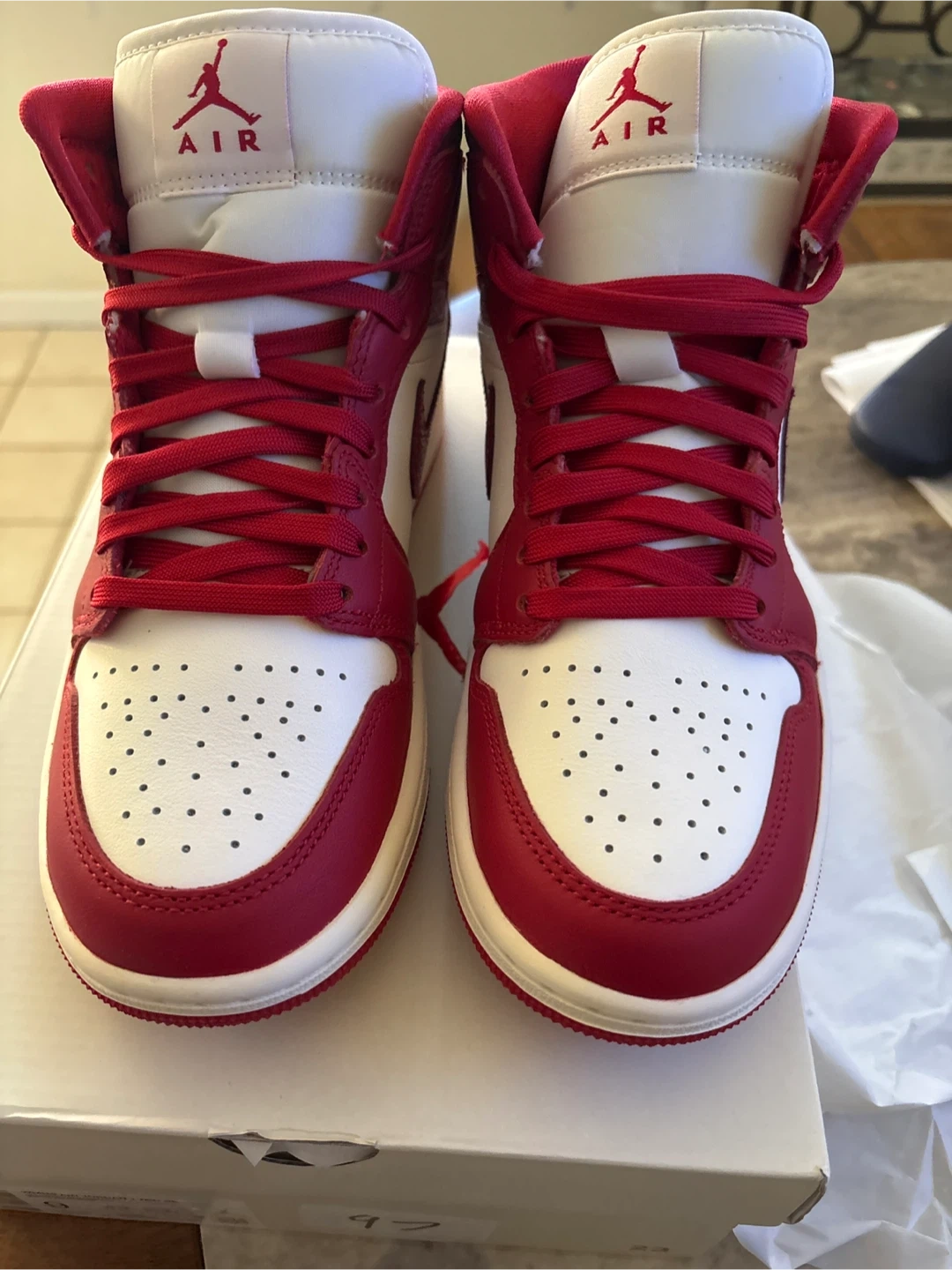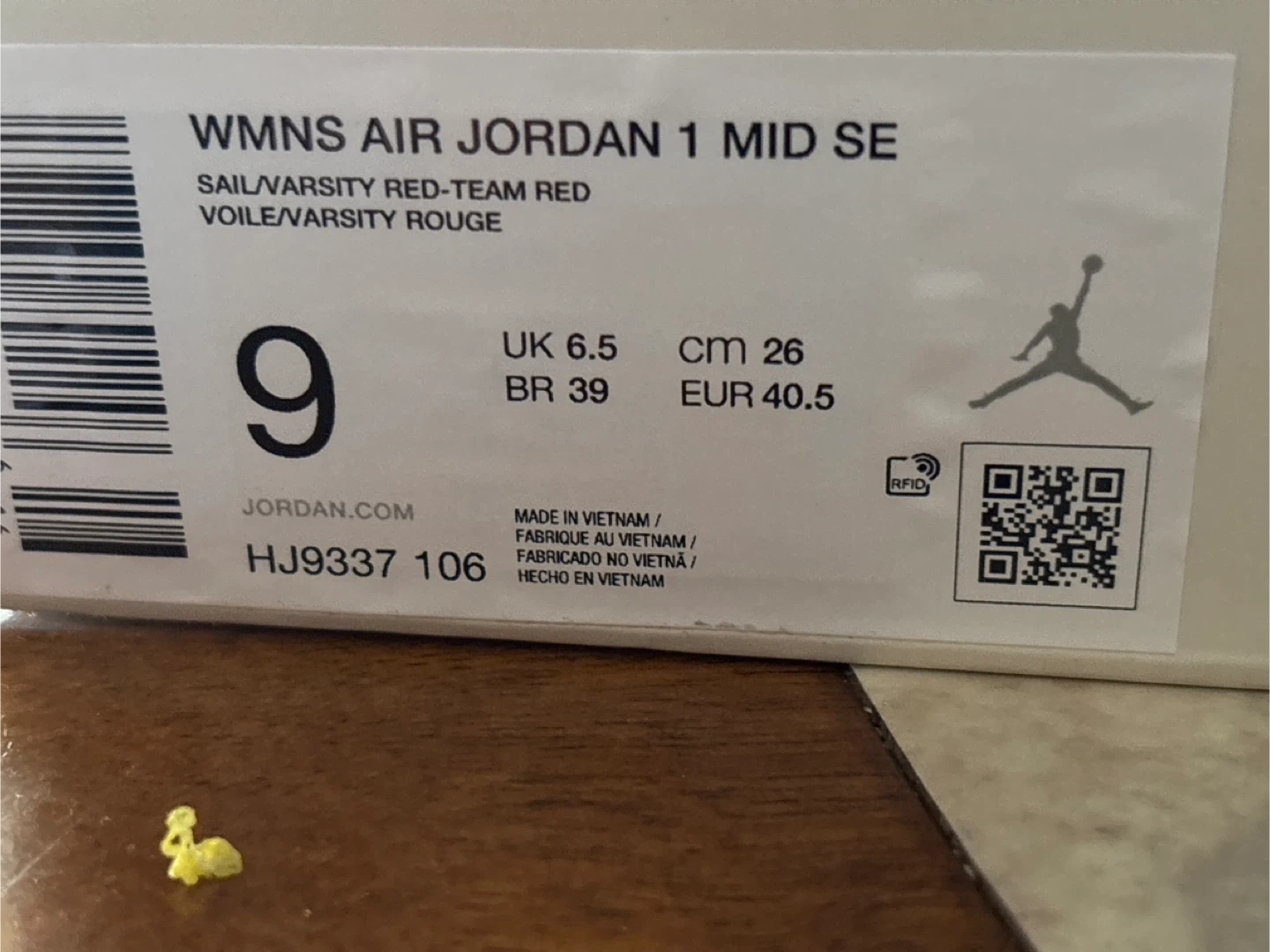 Women's Air Jordan 1 Mid SE sneakers in a Sail and Varsity Red colorway. Size US 9 (UK 6.5, EUR 40.5, CM 26). Includes original box. These shoes offer a classic mid-top silhouette with a distinctive color combination.