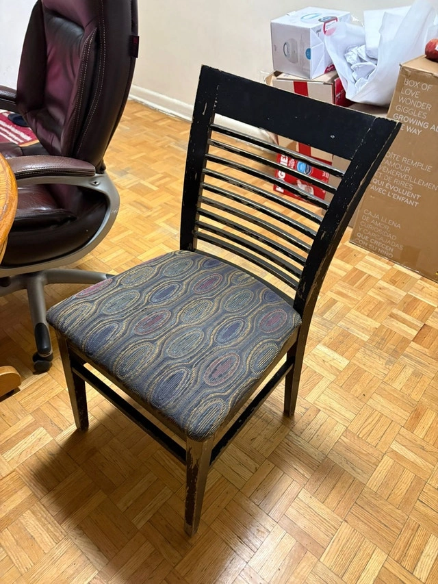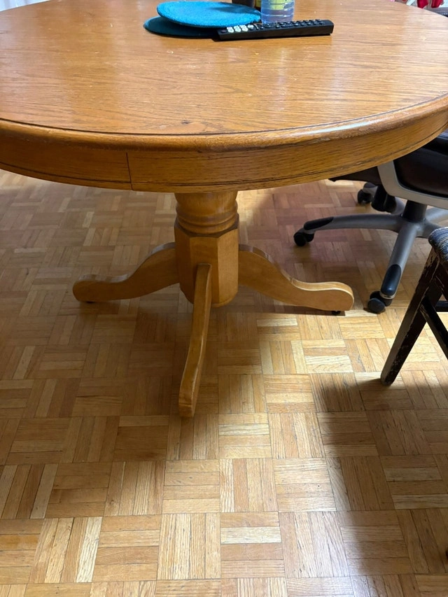 This is a round dining table perfect for a cozy dining space, accompanied by 2 matching chair. It is in good condition, showing signs of wear that add character to its solid construction. Perfect for intimate meals or as a charming accent piece in your home. It brings a touch of warmth to any room. If the ad is up, the table is available!