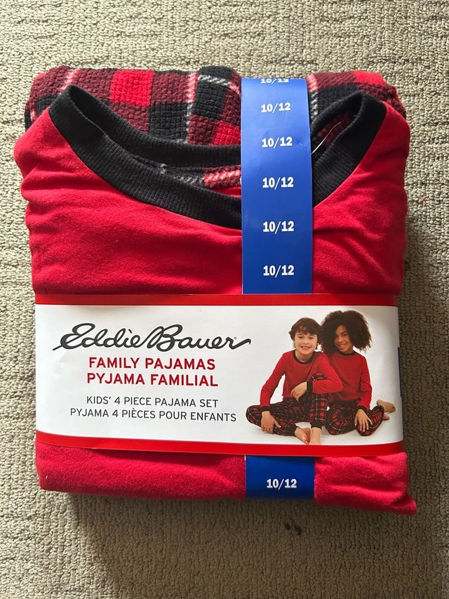 Brand new set of Eddie Bauer kids' 4-piece pajamas, perfect for cozy nights! This set includes 2x long-sleeved red tops and 2x plaid bottoms. The set is new, complete with tags.