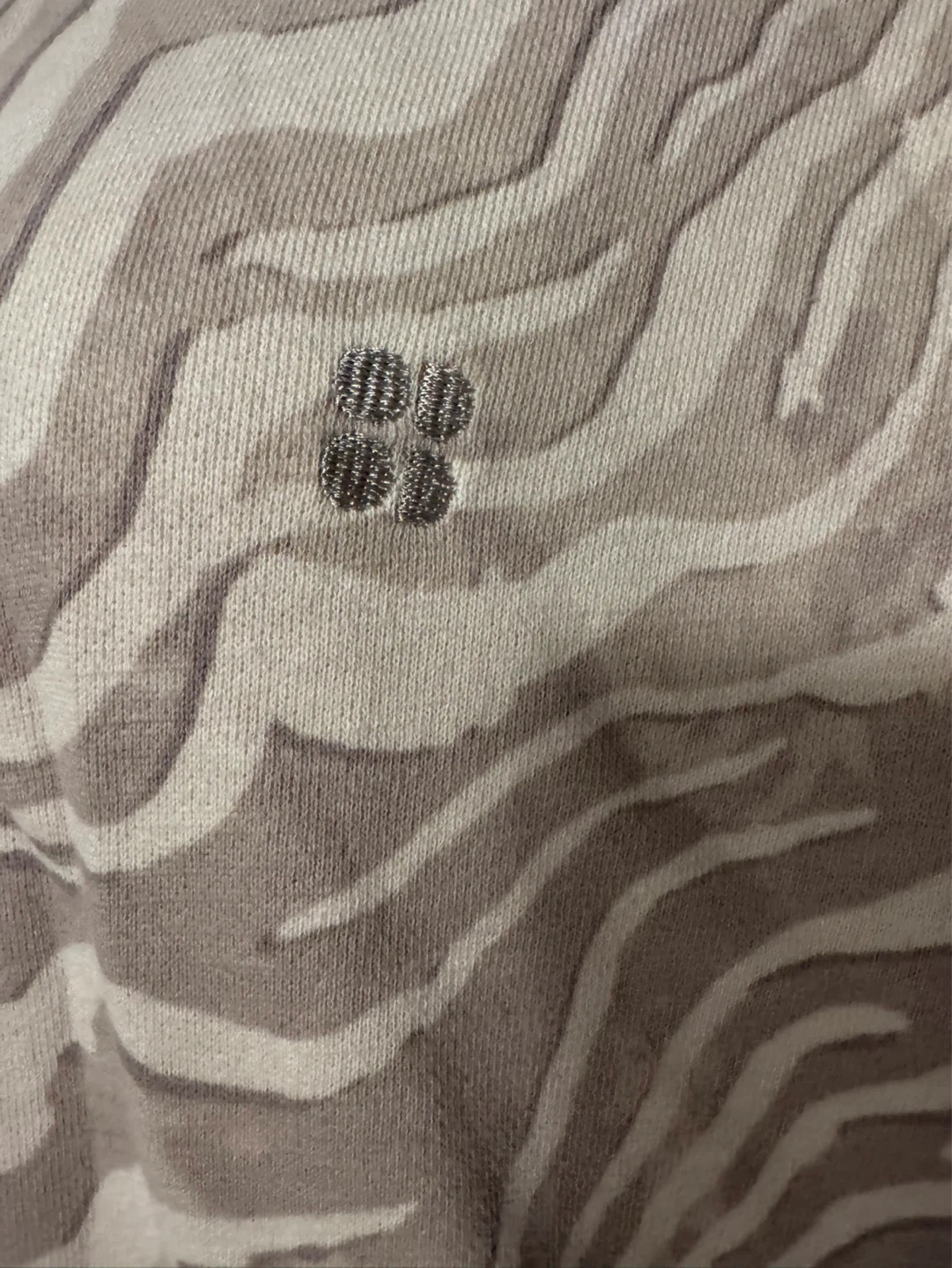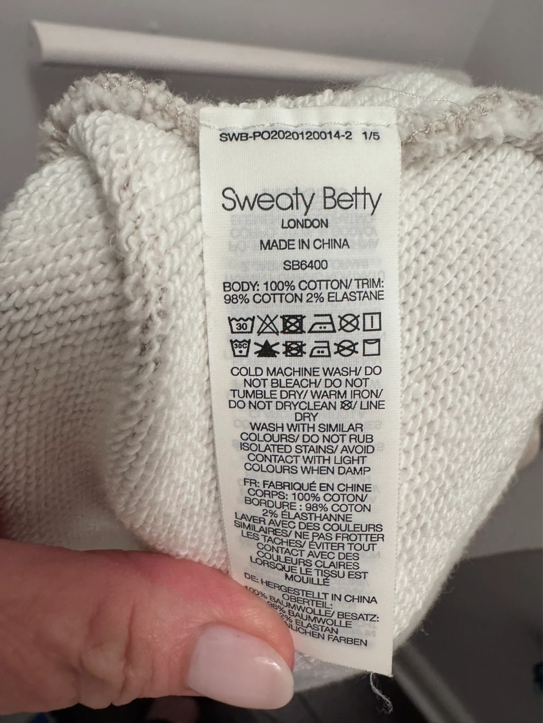 This is a Sweaty Betty hoodie with a zebra print. It's made from 98% cotton and 2% elastane. The body is 100% cotton, and the trim is 98% cotton with 2% elastane. Slightly cropped w pockets. NWOT