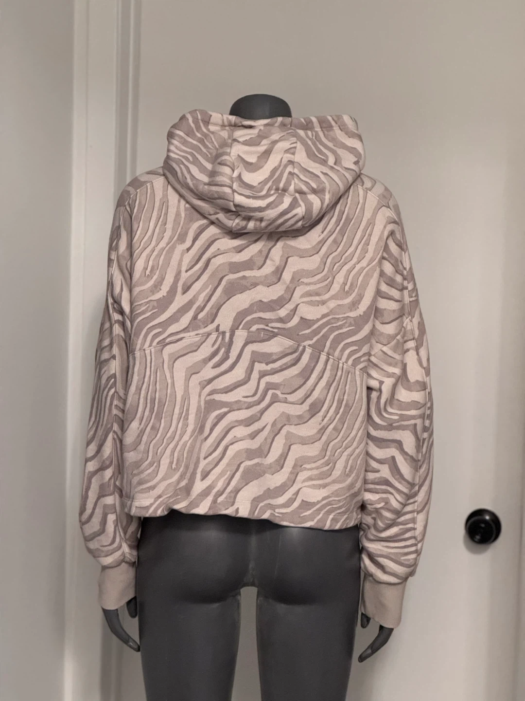 This is a Sweaty Betty hoodie with a zebra print. It's made from 98% cotton and 2% elastane. The body is 100% cotton, and the trim is 98% cotton with 2% elastane. Slightly cropped w pockets. NWOT