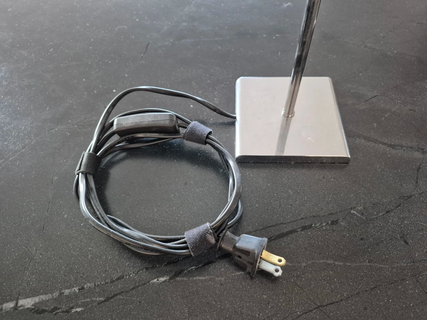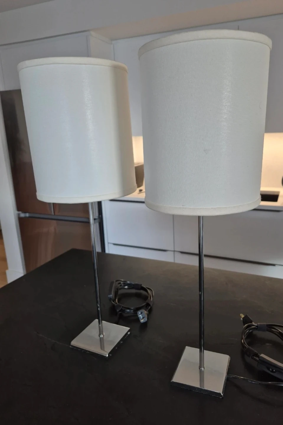 Each lamp features a sleek chrome stand and a simple cream cylindrical lampshade.