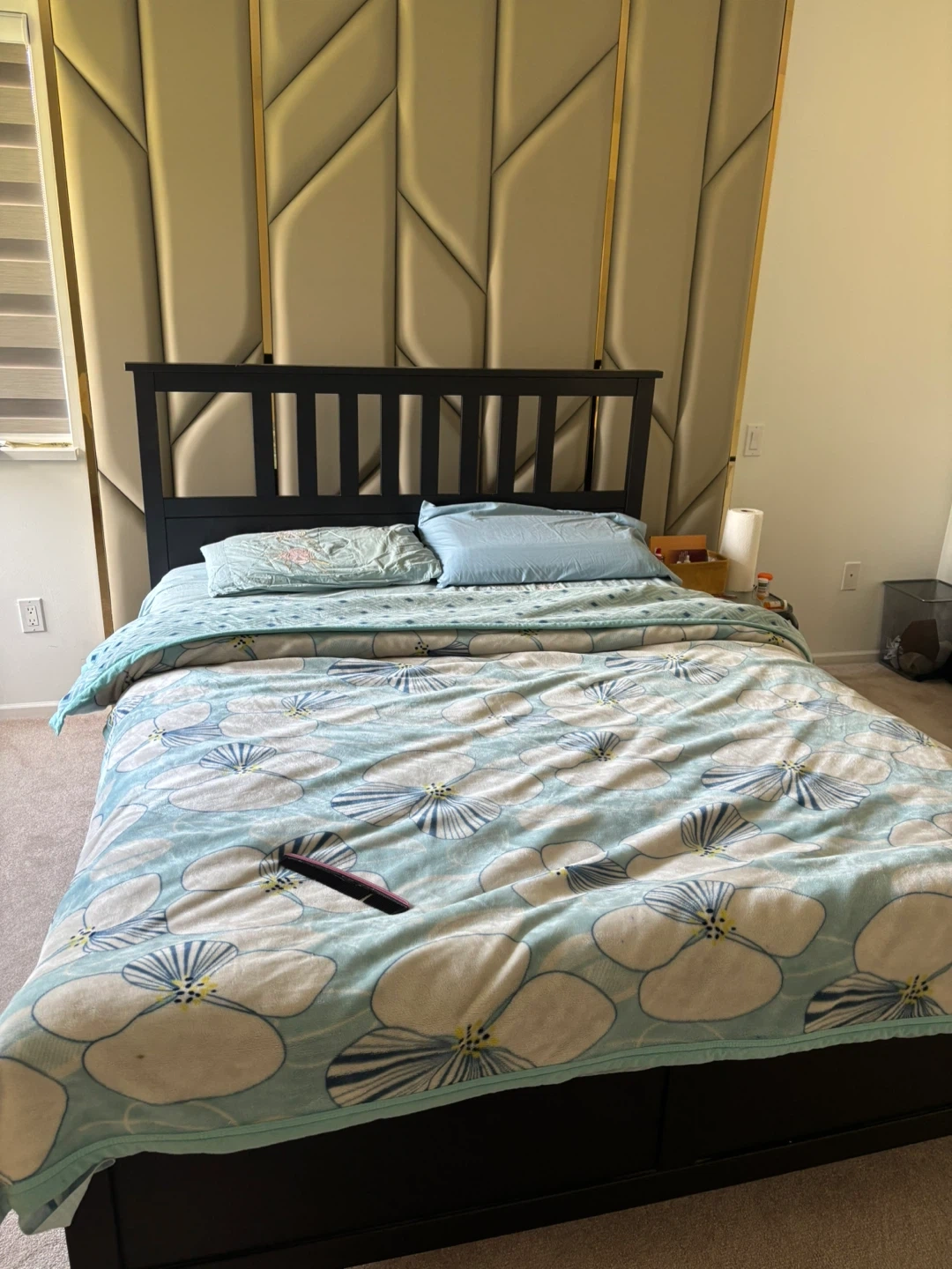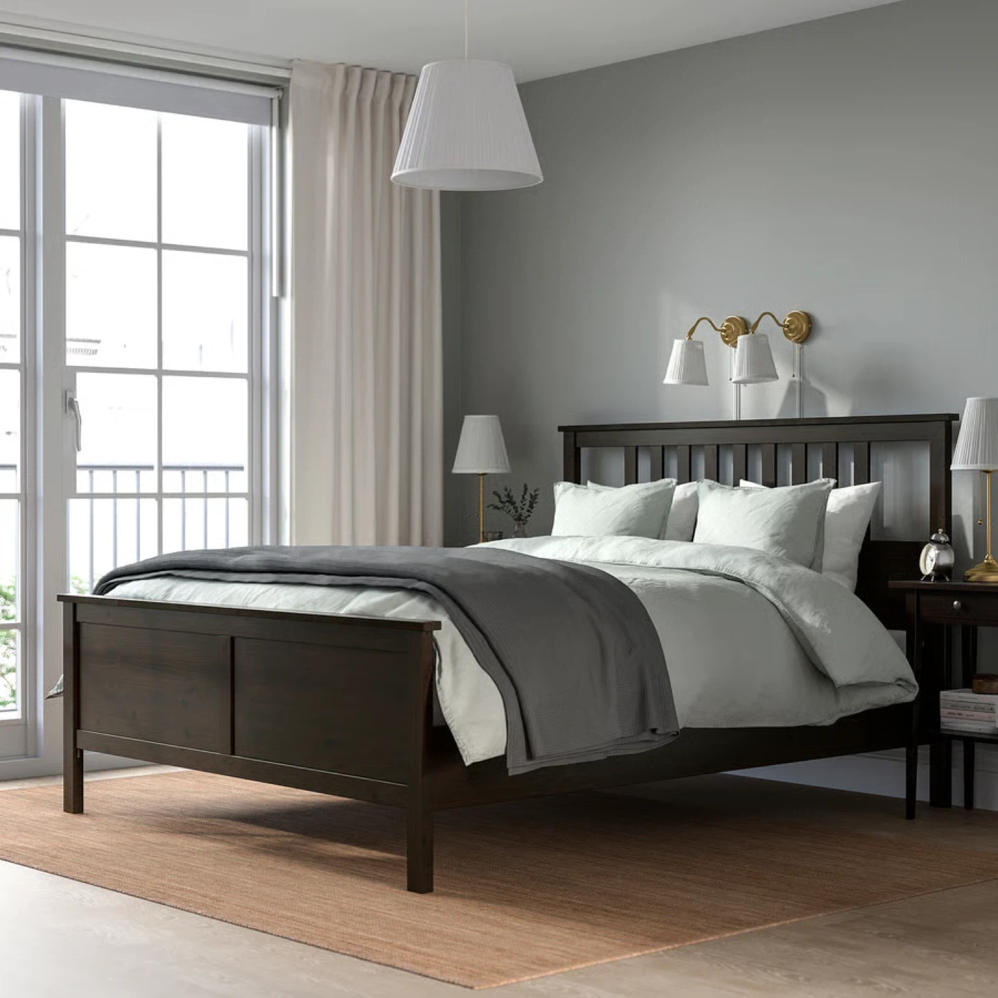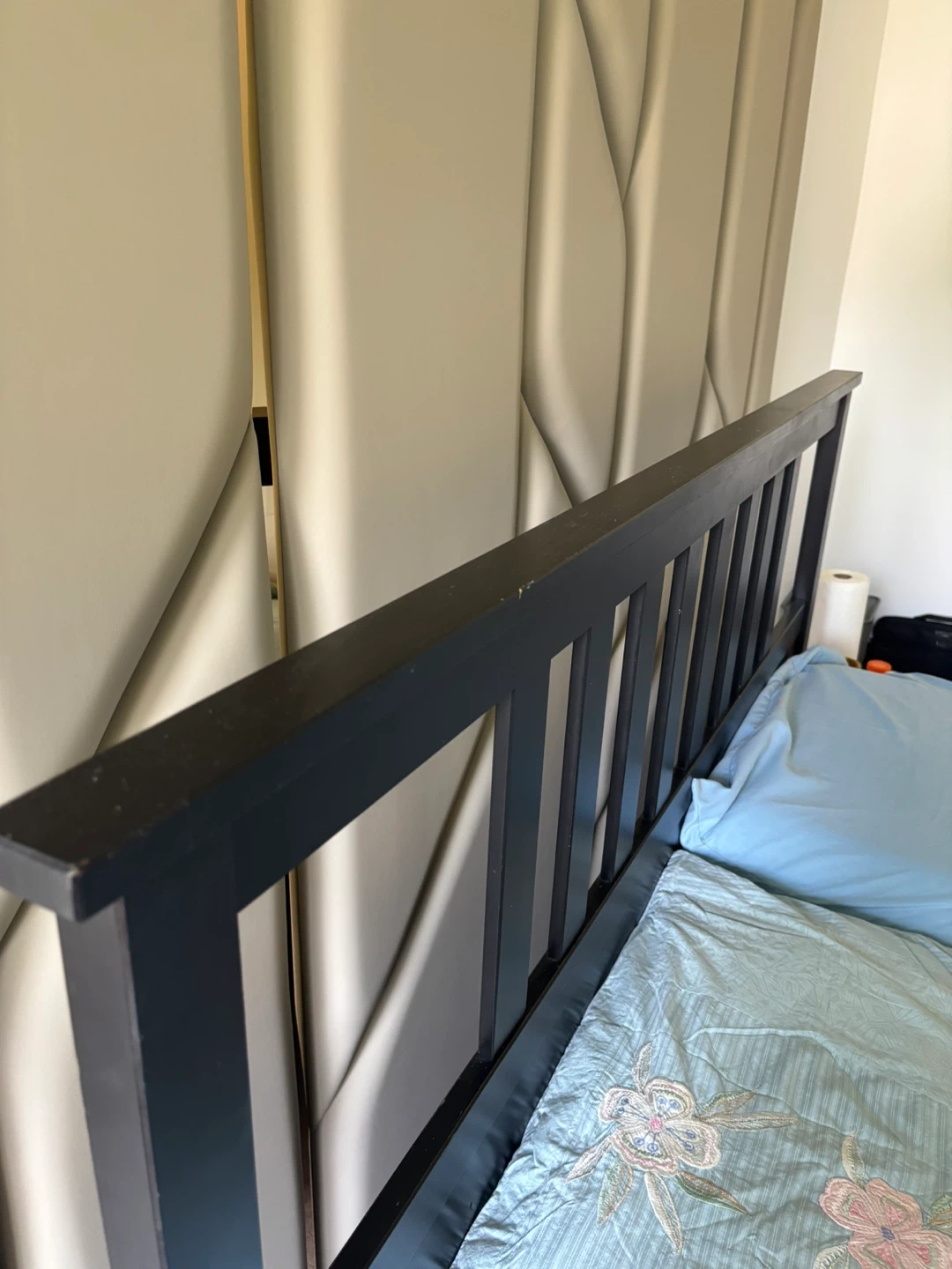 A classic dark wood bed frame with a slatted headboard. It has a sturdy construction and a timeless design. This bed frame provides a solid foundation for your mattress. The frame does have some minor scuffs but they’re easily covered by the sheets.