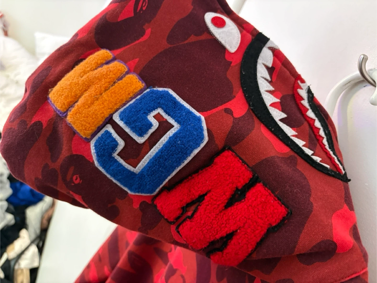 This BAPE hoodie features the iconic red camouflage pattern. It's a full-zip style with embroidered lettering on the front. This piece is great for adding a streetwear vibe to your look.