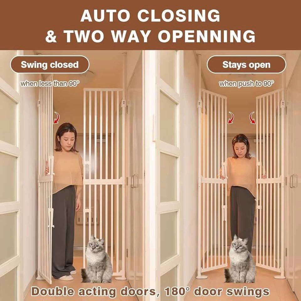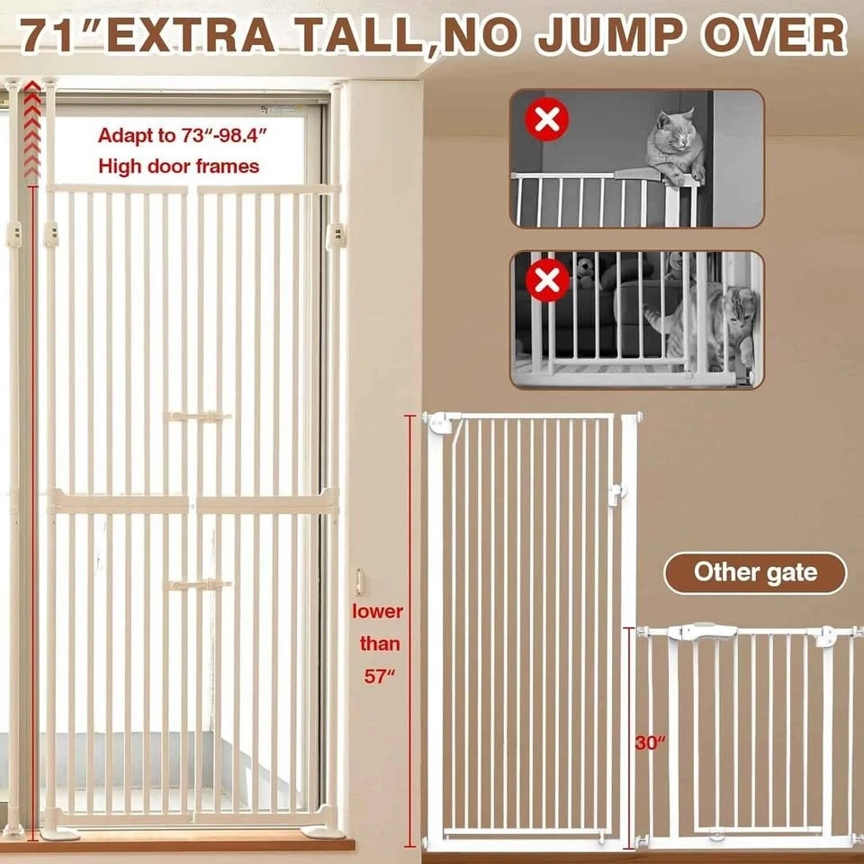 Brand new extra tall cat gate, jump proof and durable. Features adjustable width from 33" to 37.8", no wall drilling required. It has 1.3" narrow bar spacing, a bidirectional opening design, and is lightweight. Perfect for doorways. White color.