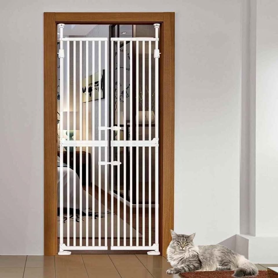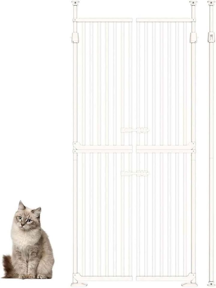 Brand new extra tall cat gate, jump proof and durable. Features adjustable width from 33" to 37.8", no wall drilling required. It has 1.3" narrow bar spacing, a bidirectional opening design, and is lightweight. Perfect for doorways. White color.