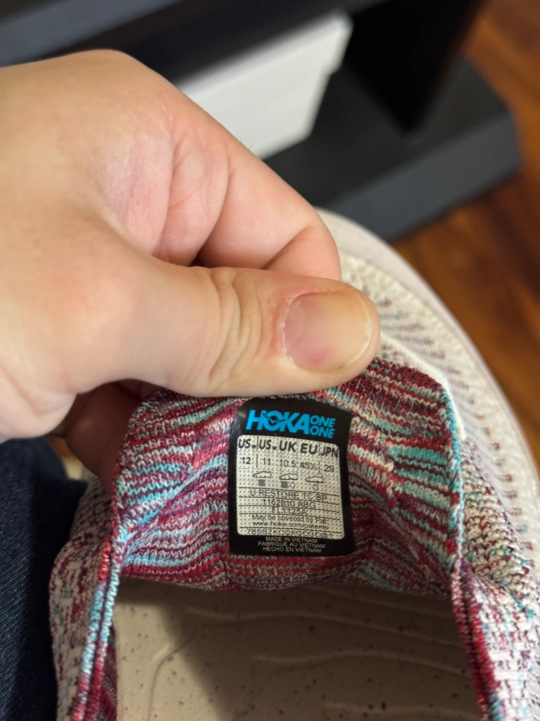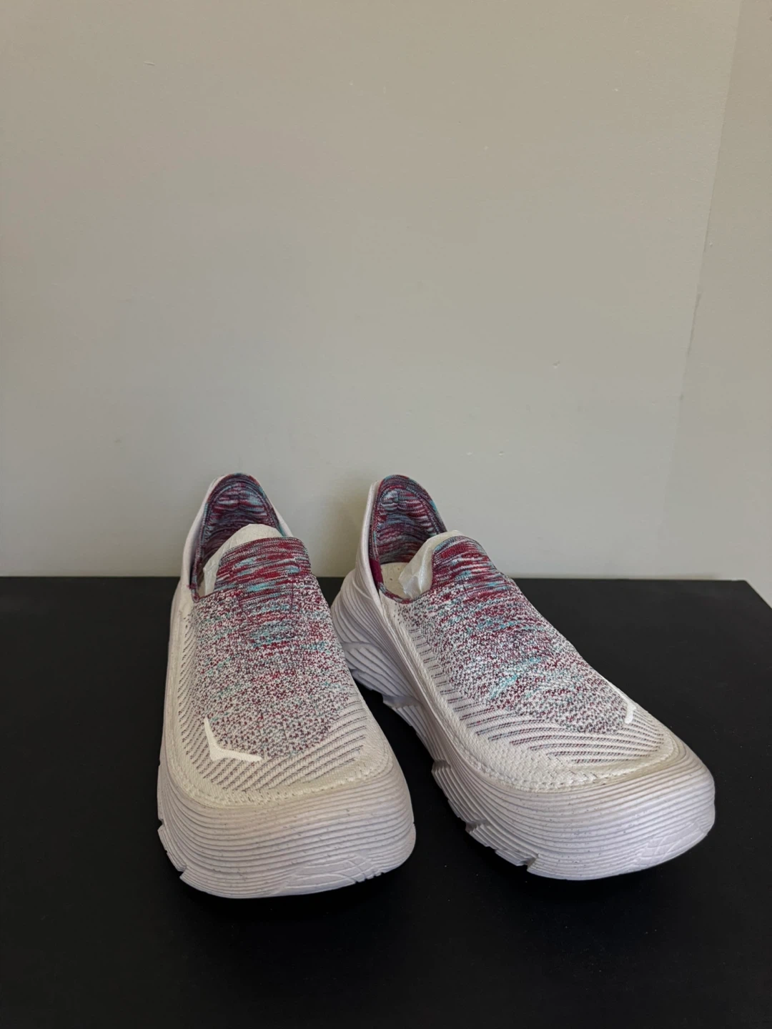 These Hoka One One slip-on sneakers are designed for comfort and ease of wear. They feature a knit upper with a colourful marled pattern and a durable sole. Brand new in box