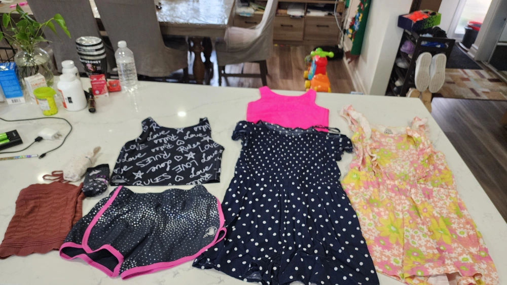 Bundle includes 10 pieces of clothing. Floral print dresses, polka dot dress, tank top, shorts, and a tank top.