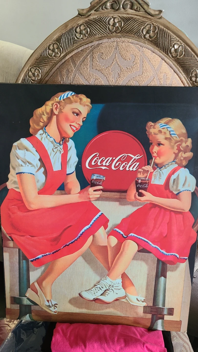 Classic Coca-Cola advertisement featuring a mother and daughter. This vintage-style sign displays a heartwarming scene with the iconic red logo. It's made of durable material, perfect for home decor or a collector's item.