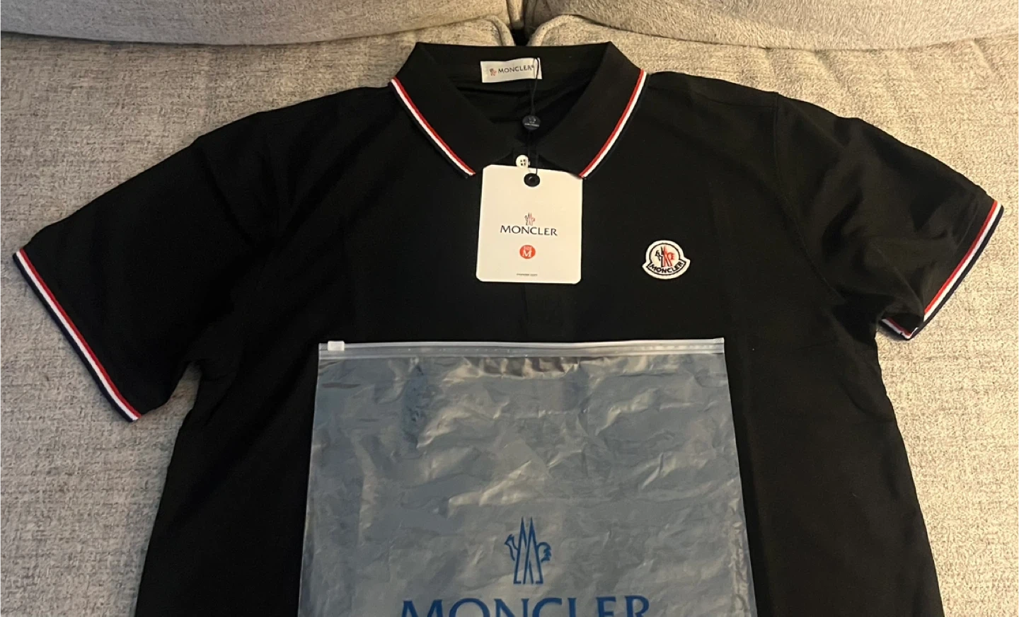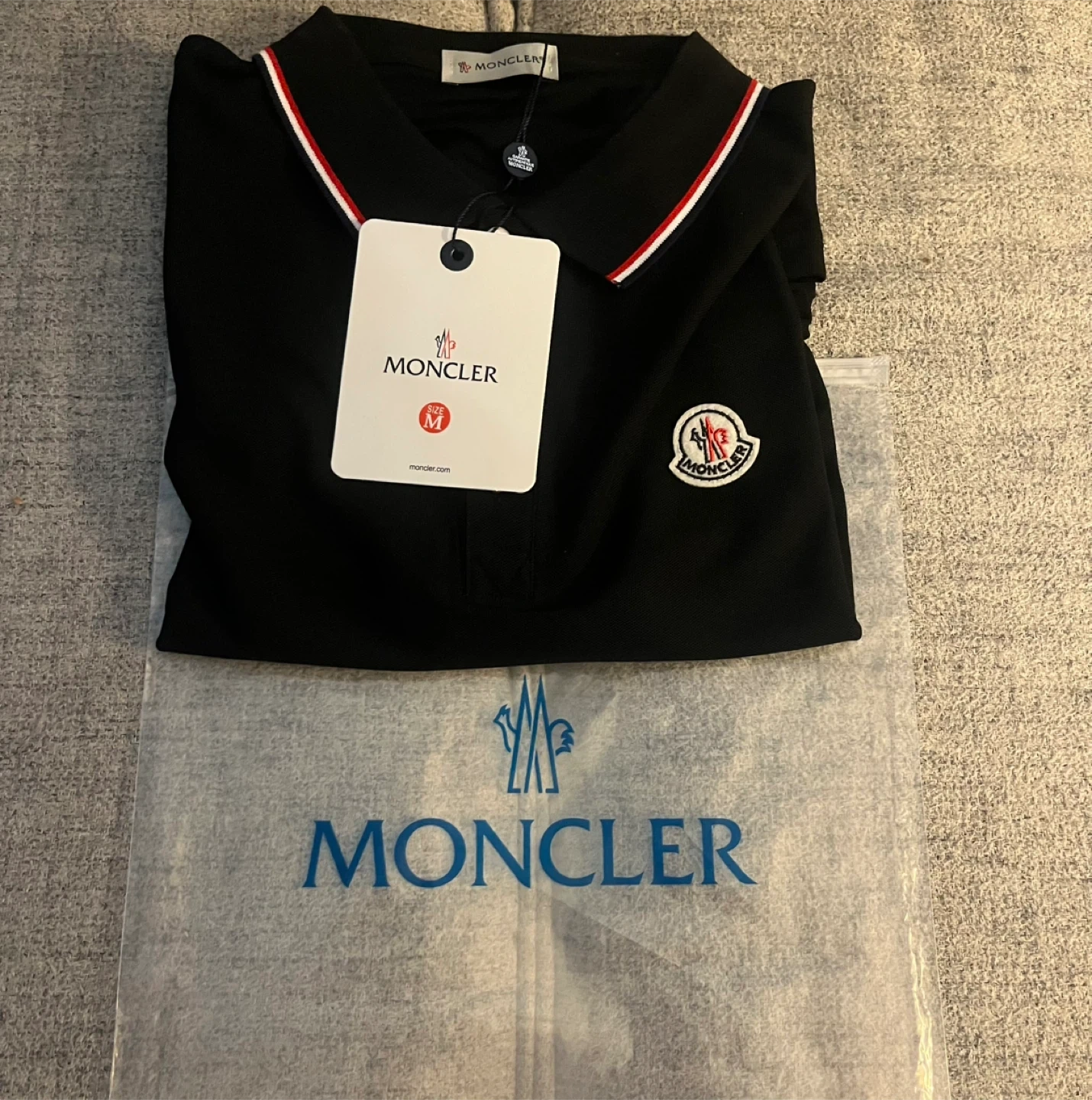 Brand new Moncler polo shirts, available in pink and black. Comes with original packaging. Size medium. These shirts feature a classic polo collar with striped trim and embroidered Moncler logos.