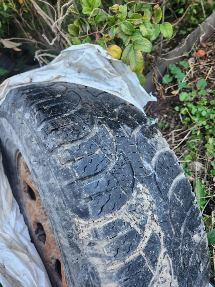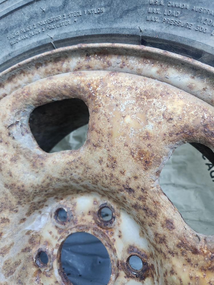 Used steel wheel and tire. Tire has some wear. Rim has rust. Sold as is.