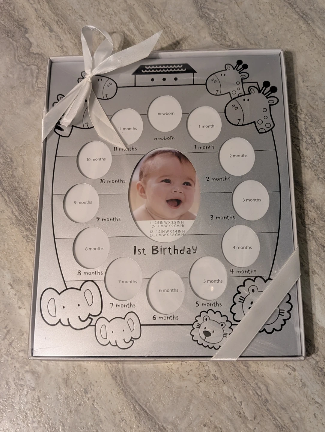 This baby photo frame is designed to celebrate your little one's first year. It includes slots for photos from newborn up to 11 months, plus a central spot for their 1st birthday picture. The frame features cute animal graphics (giraffes, elephants, and lions).