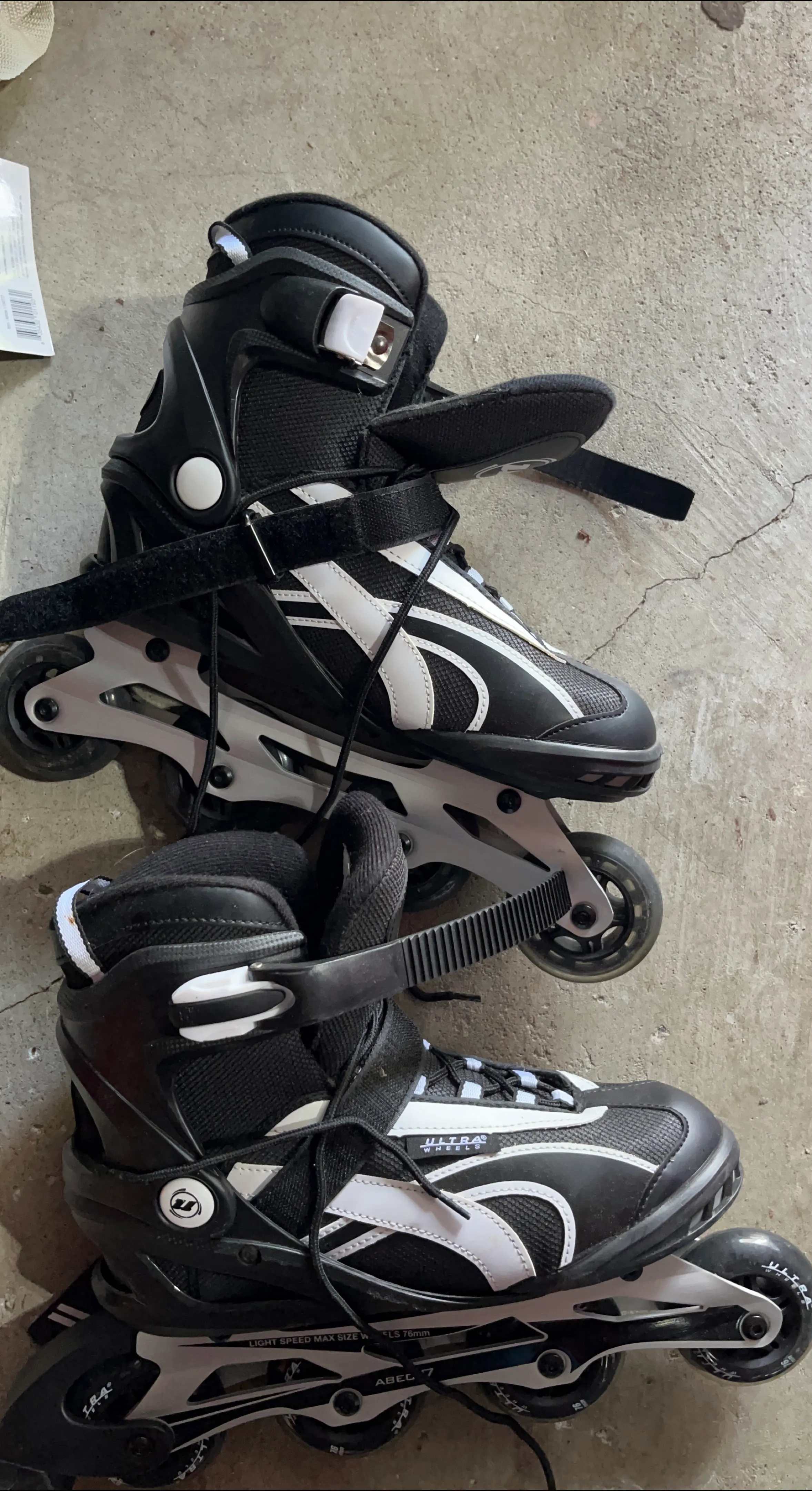 Get ready to roll with these Ultra Wheels inline skates! They are in great shape and ready for some fun. They feature light speed max size wheels 76mm and ABEC-7 bearings. Size 9.
