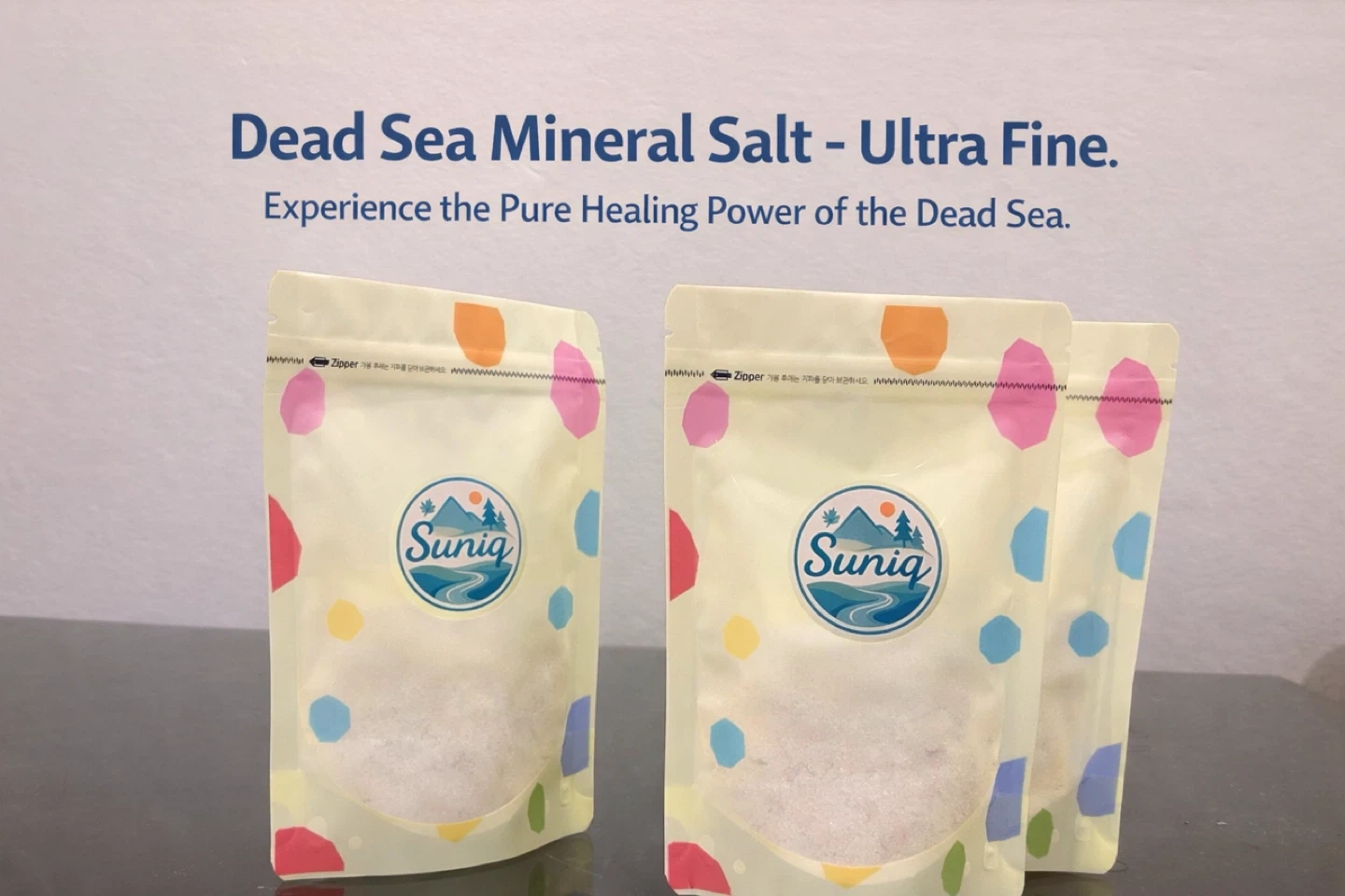 This is Suniq Dead Sea Mineral Salt, ultra fine. It's packaged in a resealable pouch. This salt is great for baths and skincare routines.