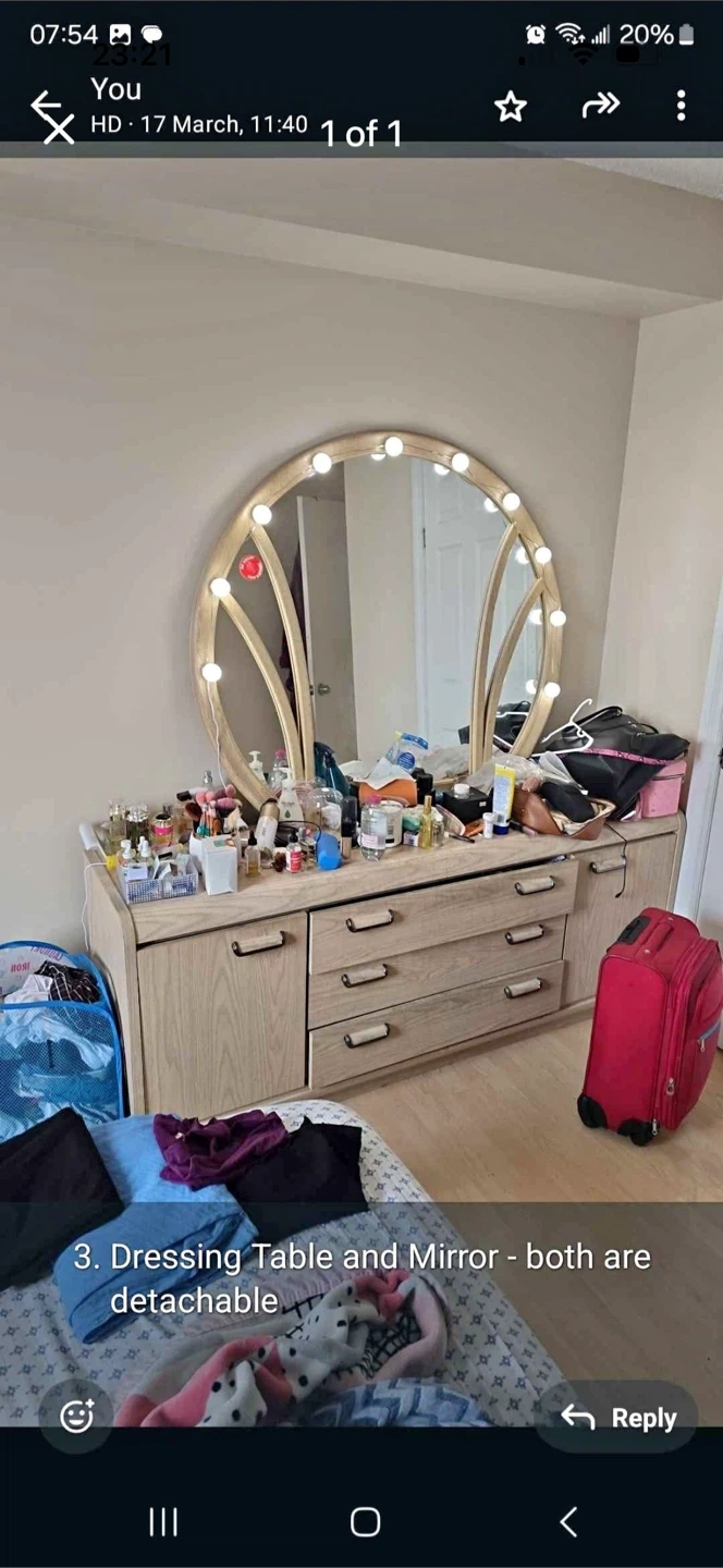 A light wood dressing table with a large mirror. The mirror and table are detachable! It has multiple drawers for storage. Great for getting ready!