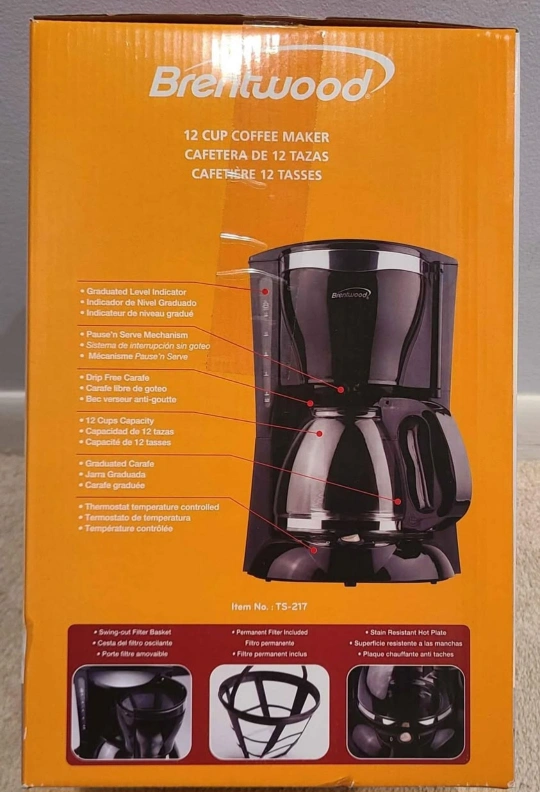 Brand new, never used Brentwood 12-cup coffee maker. Features a graduated level indicator, pause and serve mechanism, and a drip-free carafe. Includes a permanent filter. Black color.