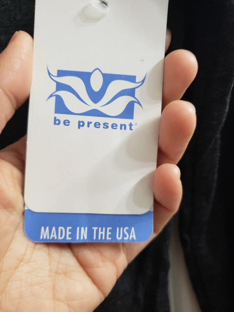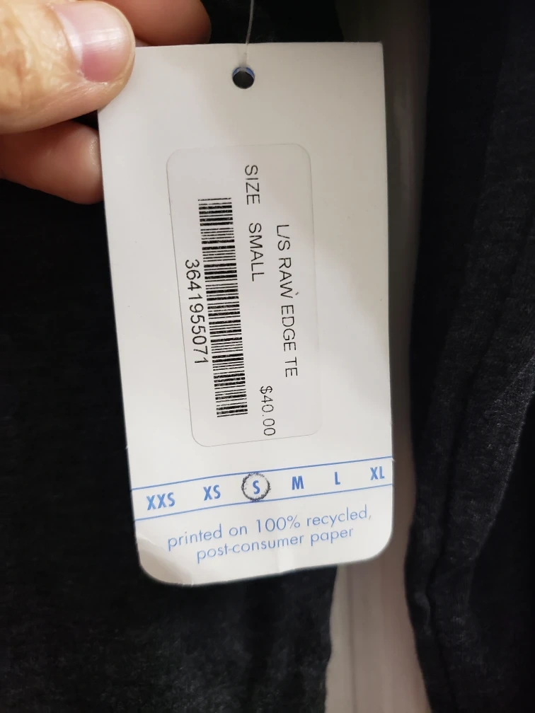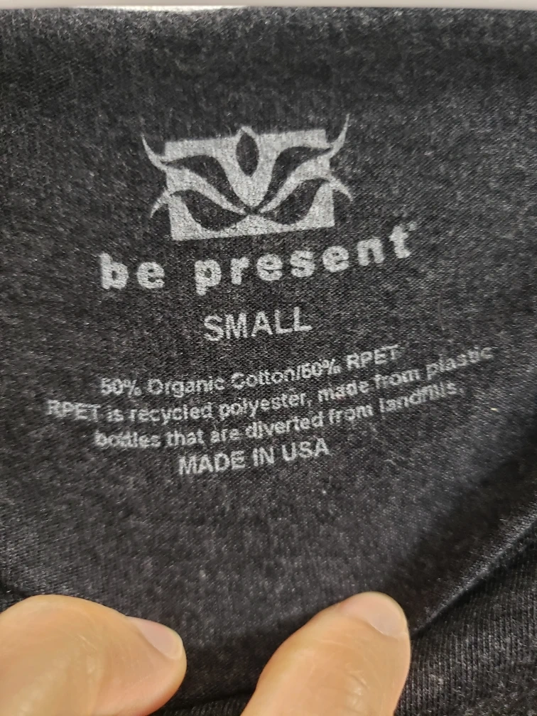 This long-sleeve t-shirt is made by Be Present. It's a size small with a raw edge detail. The material is 50% organic cotton and 50% RPET, which is recycled polyester made from plastic bottles.