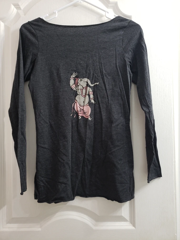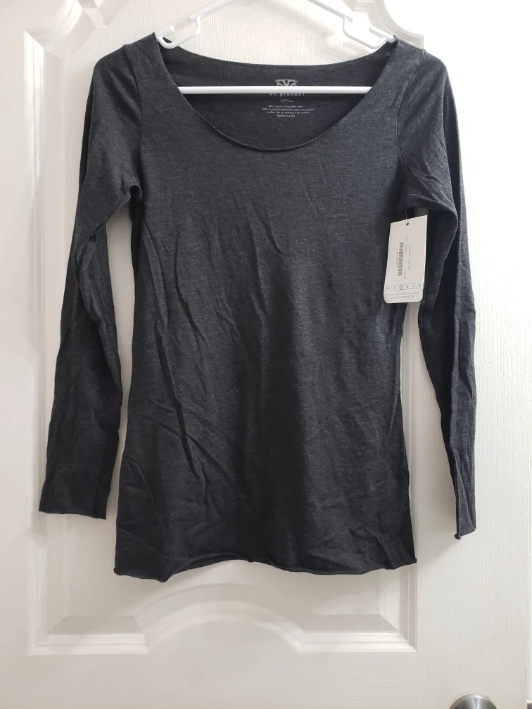 This long-sleeve t-shirt is made by Be Present. It's a size small with a raw edge detail. The material is 50% organic cotton and 50% RPET, which is recycled polyester made from plastic bottles.