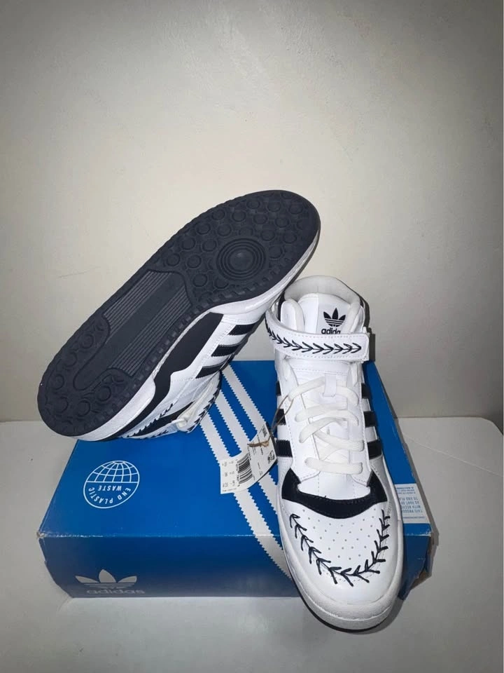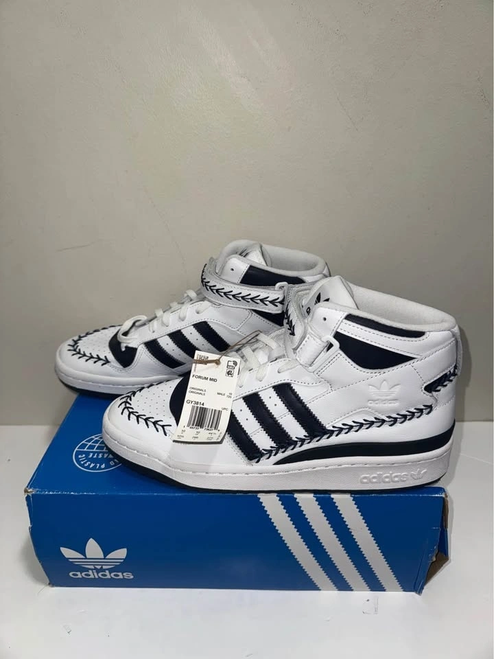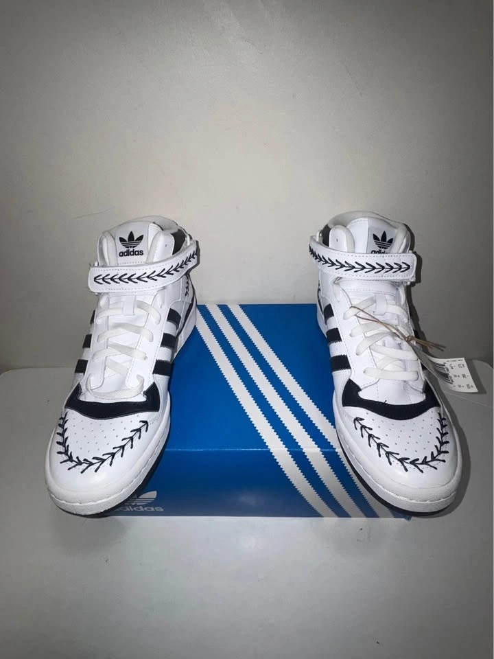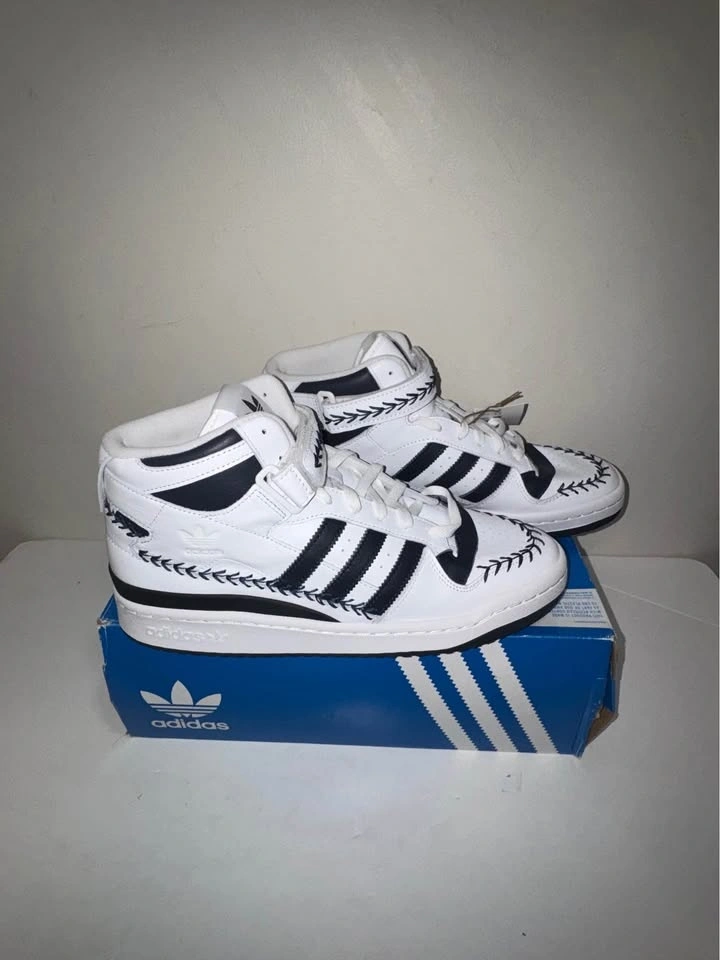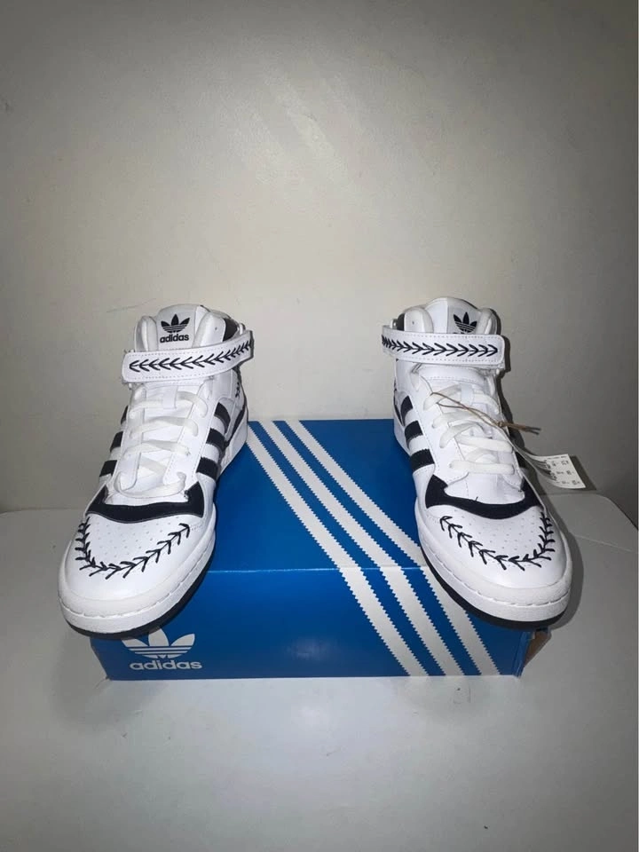 Crisp authentic Adidas Forum Mid sneakers in white with black stripes and decorative stitching. High-top style. Men's size 10.5 US. Still has tags on and comes with original box. New in box. Pick up only. Cash only. Located near Brampton Gateway Terminal and Shopper World Mall Brampton. Address will be provided when pickup time is scheduled.