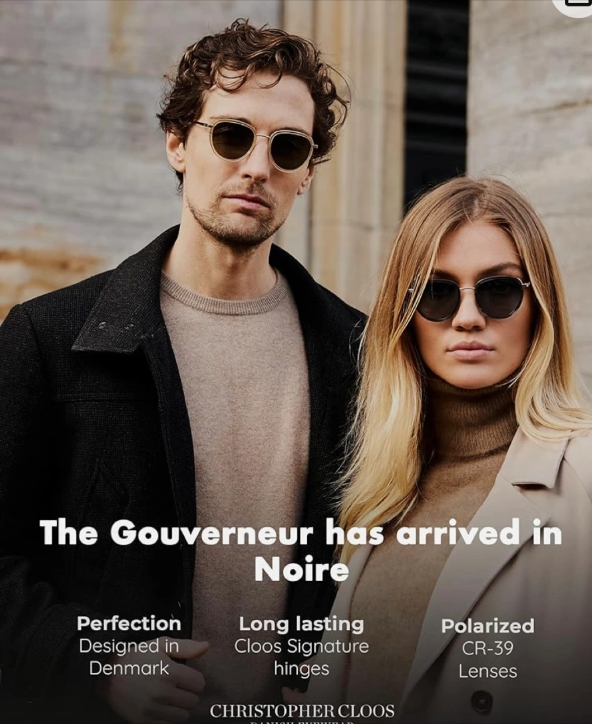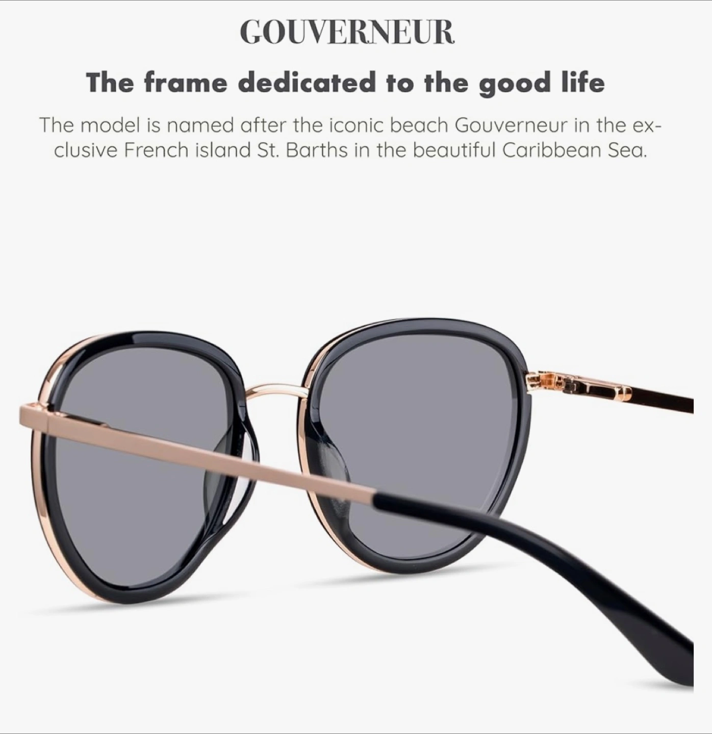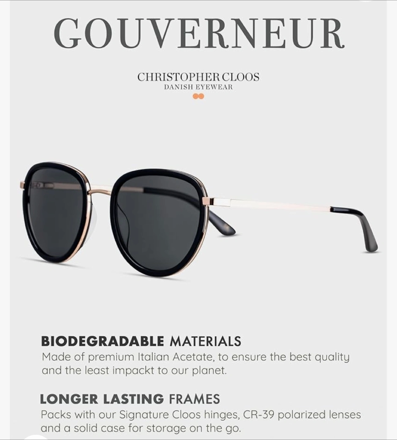 Gouverneur sunglasses by Christopher Cloos. Polarized CR-39 lenses. Black frames with rose gold accents. Includes case and cleaning cloth. Biodegradable Italian acetate.