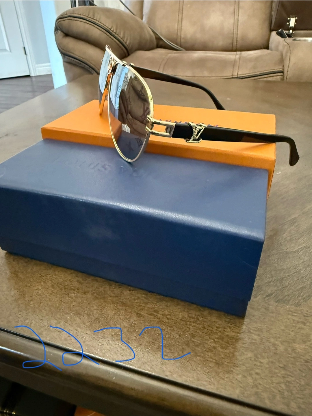 Selling a pair of Louis Vuitton aviator sunglasses. Comes with the original box. These sunglasses feature the iconic LV logo on the sides and have a stylish gold frame.
