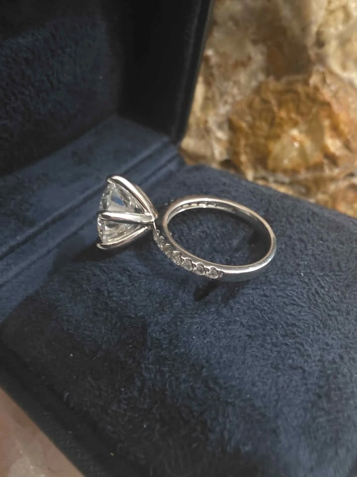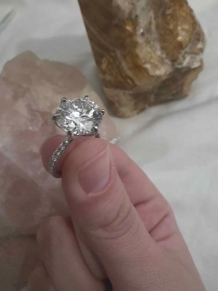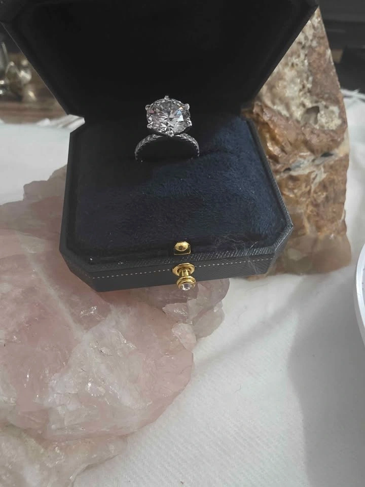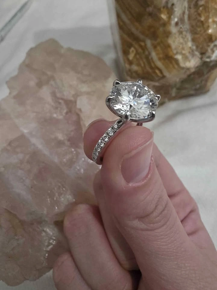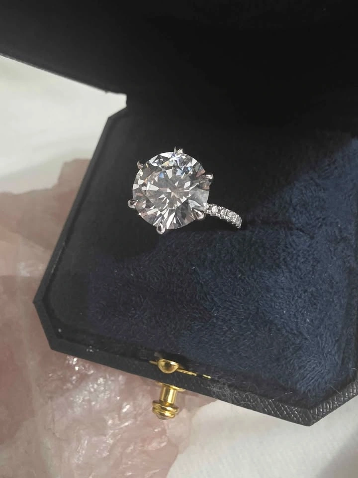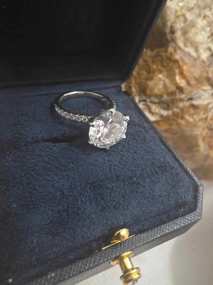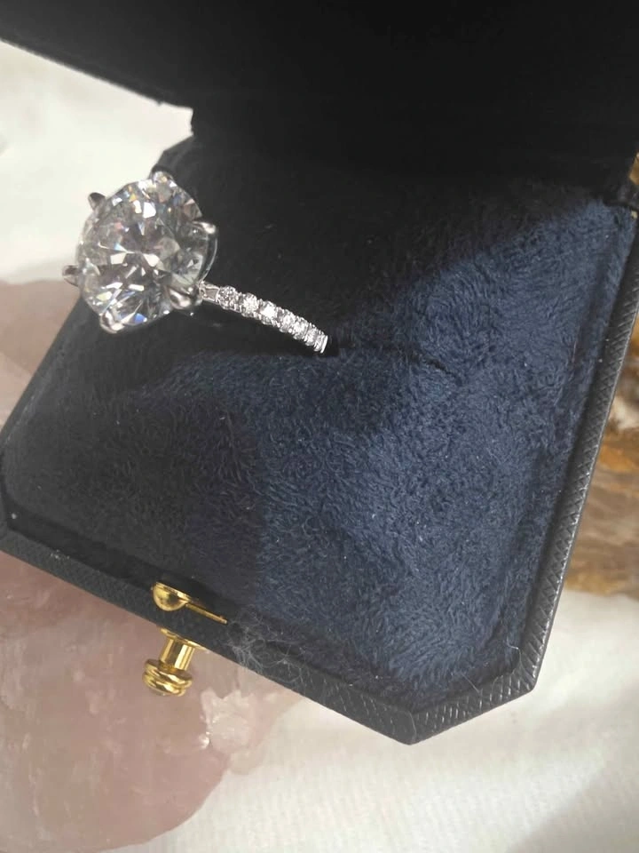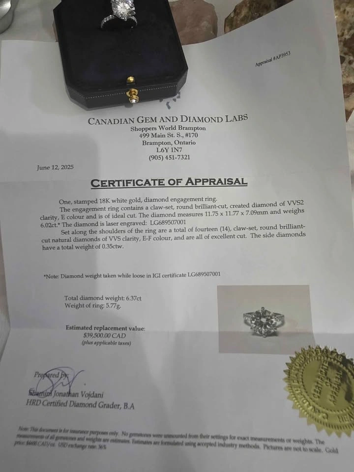 Elegant and timeless, this breathtaking diamond engagement ring is crafted in 18K white gold and features a truly impressive center stone. Main Details: Center Diamond: 6.02 carats, Cut: Round Brilliant (Ideal Cut), Clarity: VVS2, Color: E, Measurements: 11.75 × 11.77 × 7.09 mm, Laser Inscription: LG[hidden information]. Side Diamonds: 14 round brilliant diamonds, VVS clarity, E–F color, Total side weight: 0.35 carats. Total Diamond Weight: 6.37 carats. Ring Weight: 5.77 grams. Comes with a Certificate of Appraisal (June 12, 2025). Appraised Value: $39,500 CAD. This is a luxurious, high-quality piece perfect for an engagement or investment. The diamond offers exceptional brilliance, clarity, and craftsmanship.
